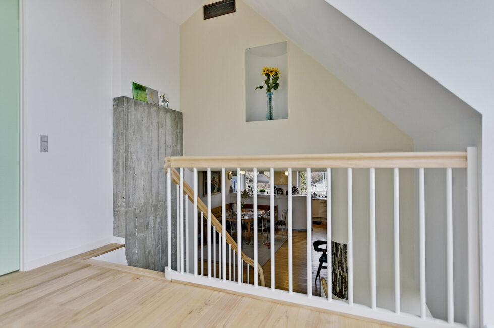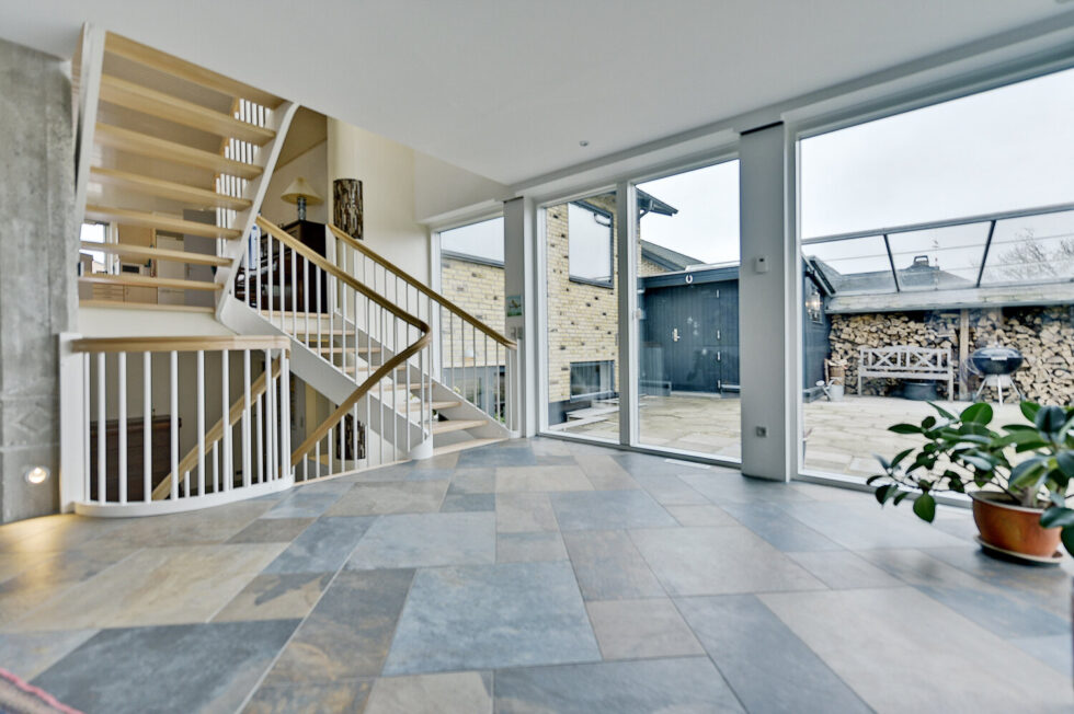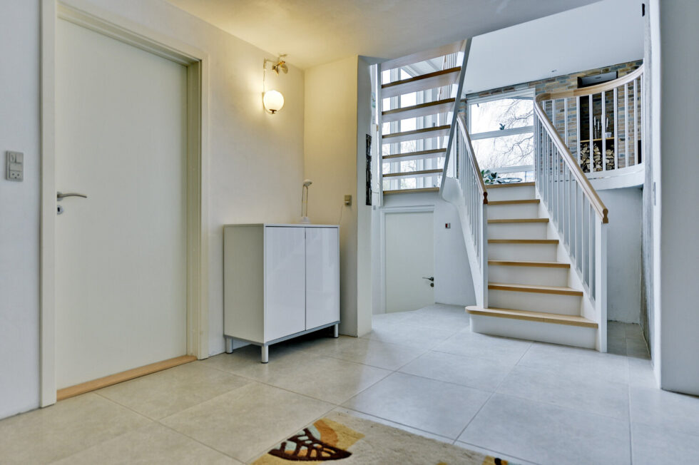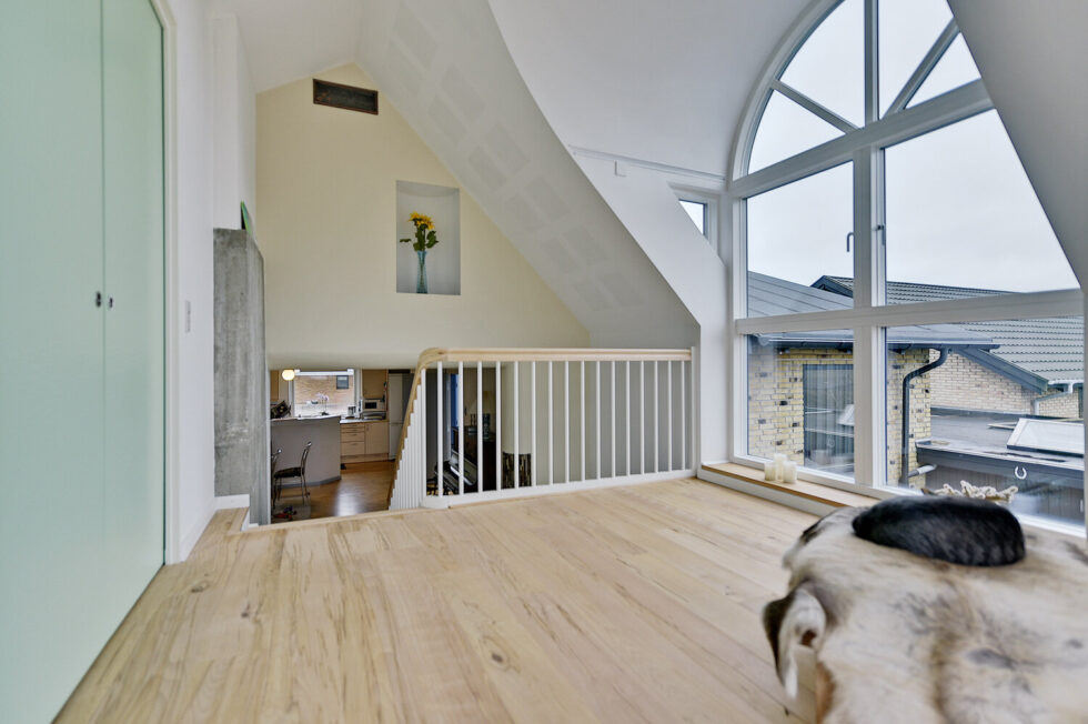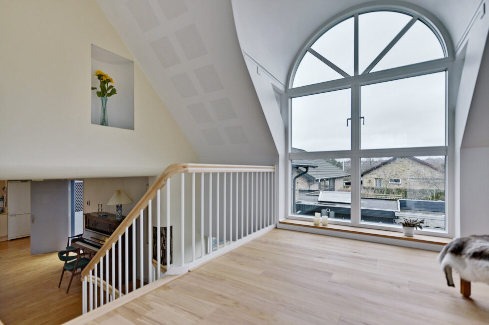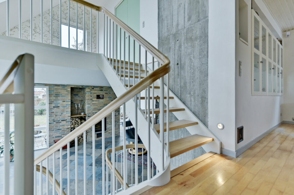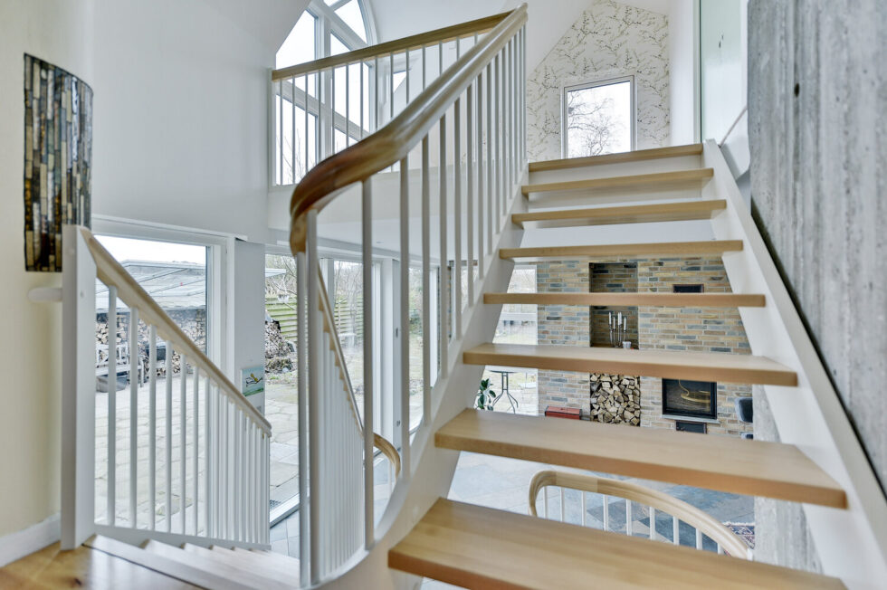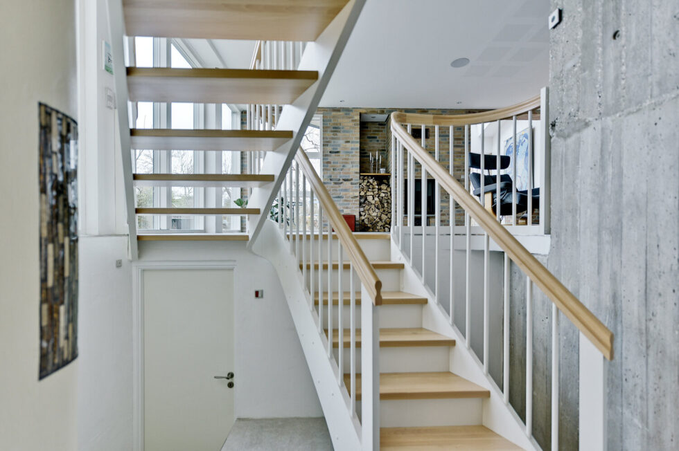 Vanger istemt, hvidmalet | Trin i eg | Håndliste H3, eg | Balustre M22, hvidmalet | Mægler A med ovenpålagt håndliste | 180 grader buet vange og håndliste i sving | Stødtrin hvidmalet i nederste trappeløb