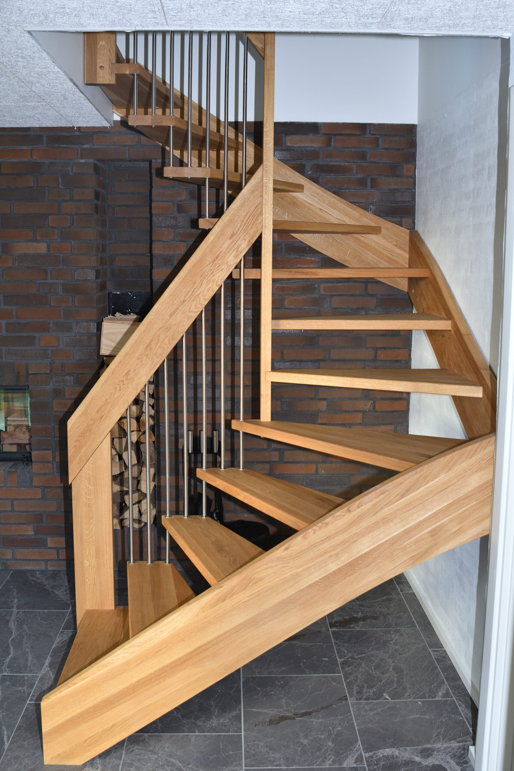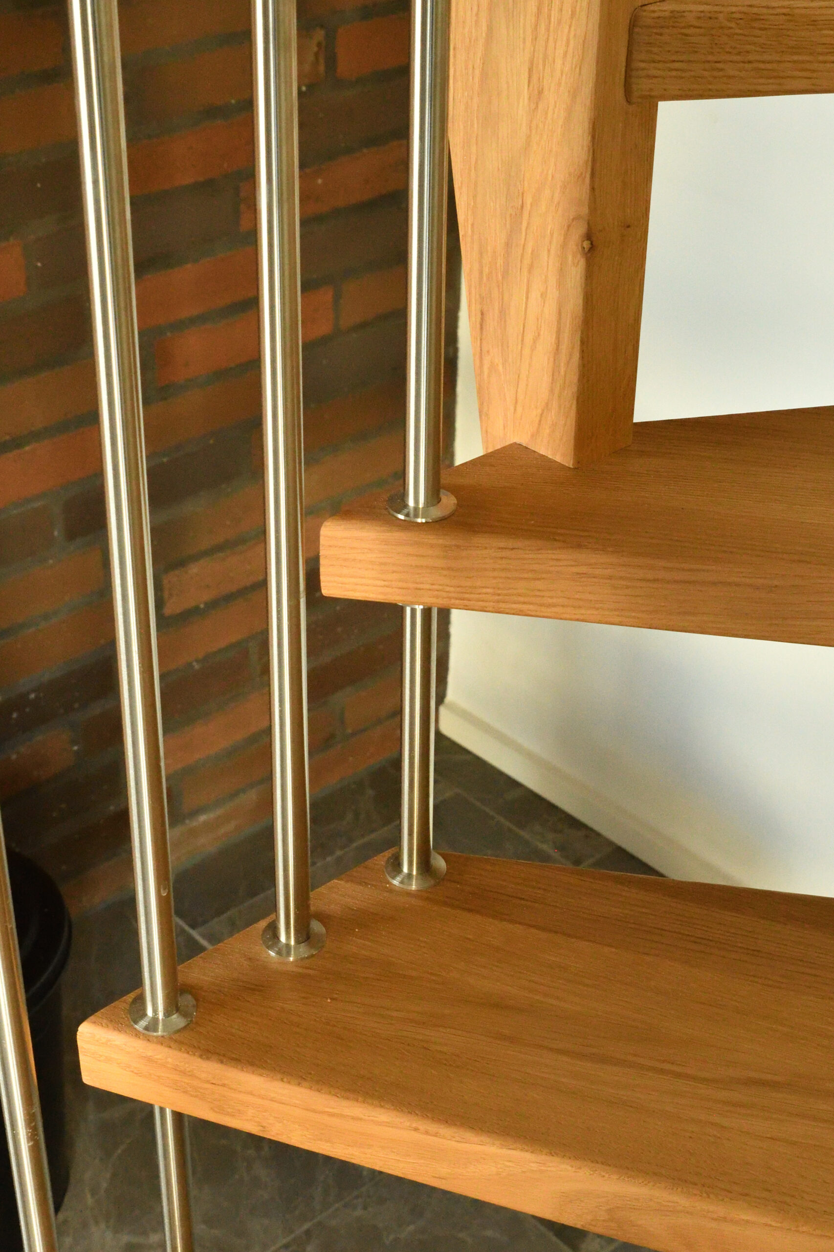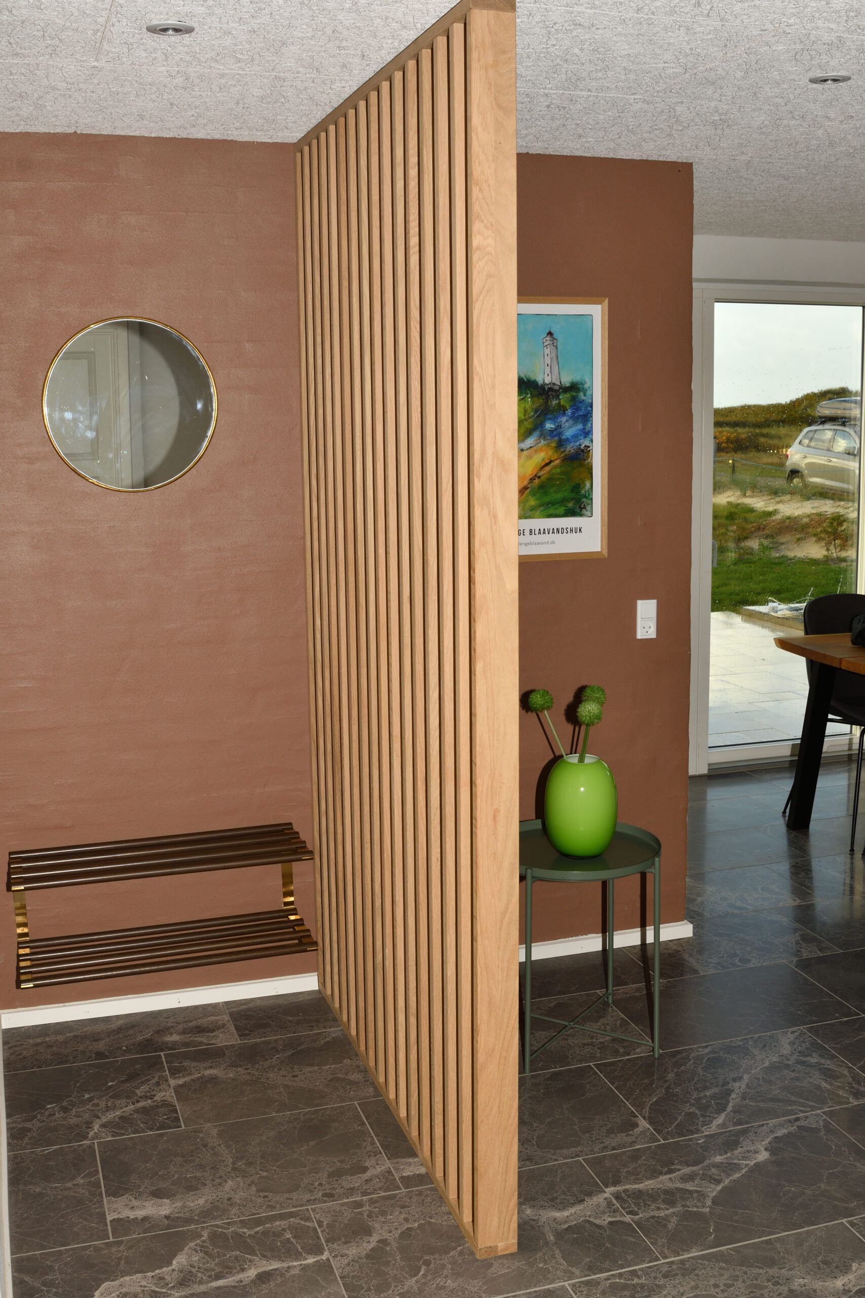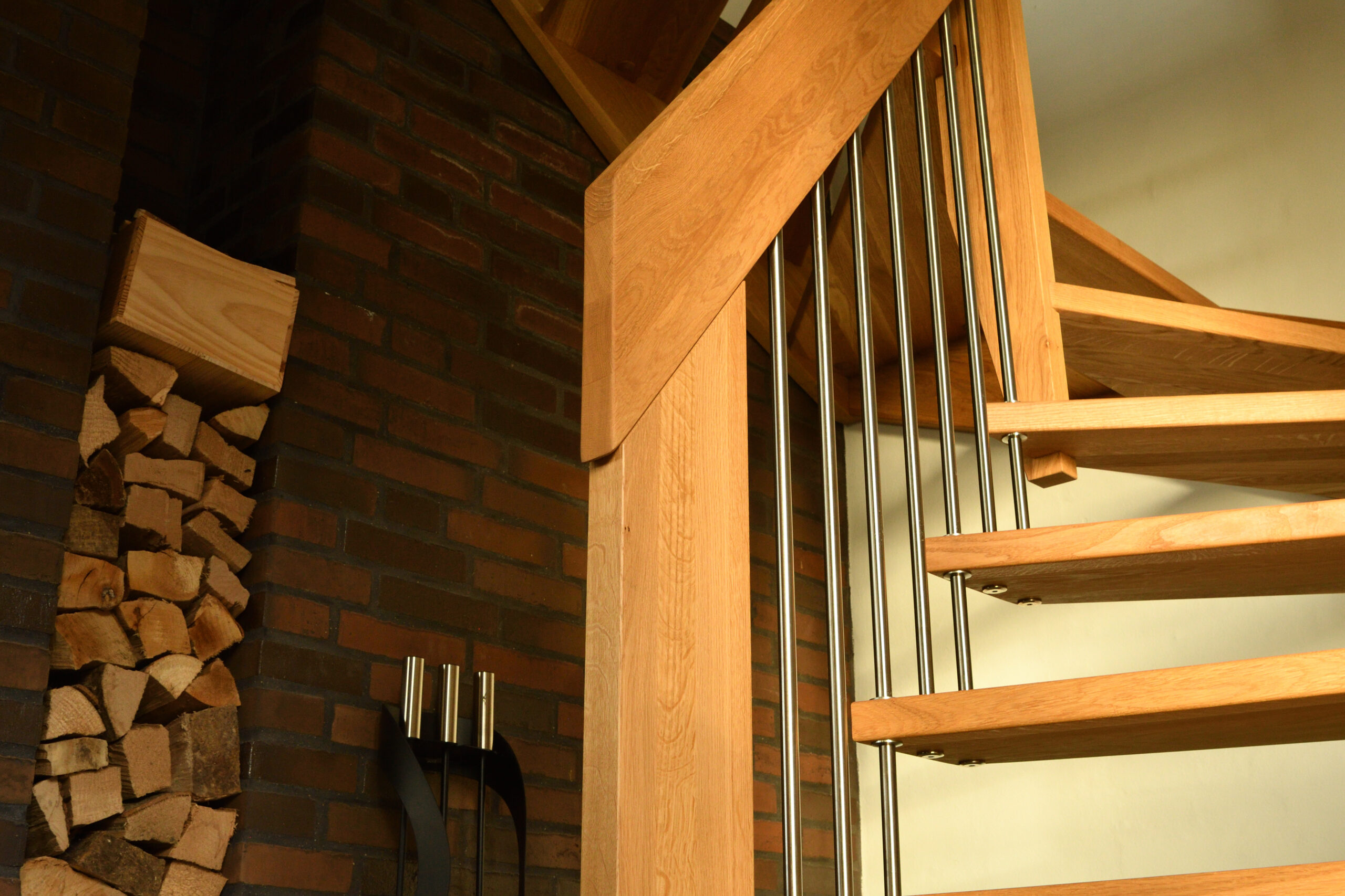 Ingen forvange – trappe som bolt trappe | Bagvange istemt, eg | Trin eg | Håndliste eg | Balustre M16, rustfri stål | Mægler 40 x 160 mm, eg | Lamelvæggen giver trappen karakter og rummet kant. Den skaber en naturlig opdeling uden at virke tung – som en form for diskret afskærmning, der samtidig tilfører noget særligt til helhedsindtrykket. | (Ref. 285589)