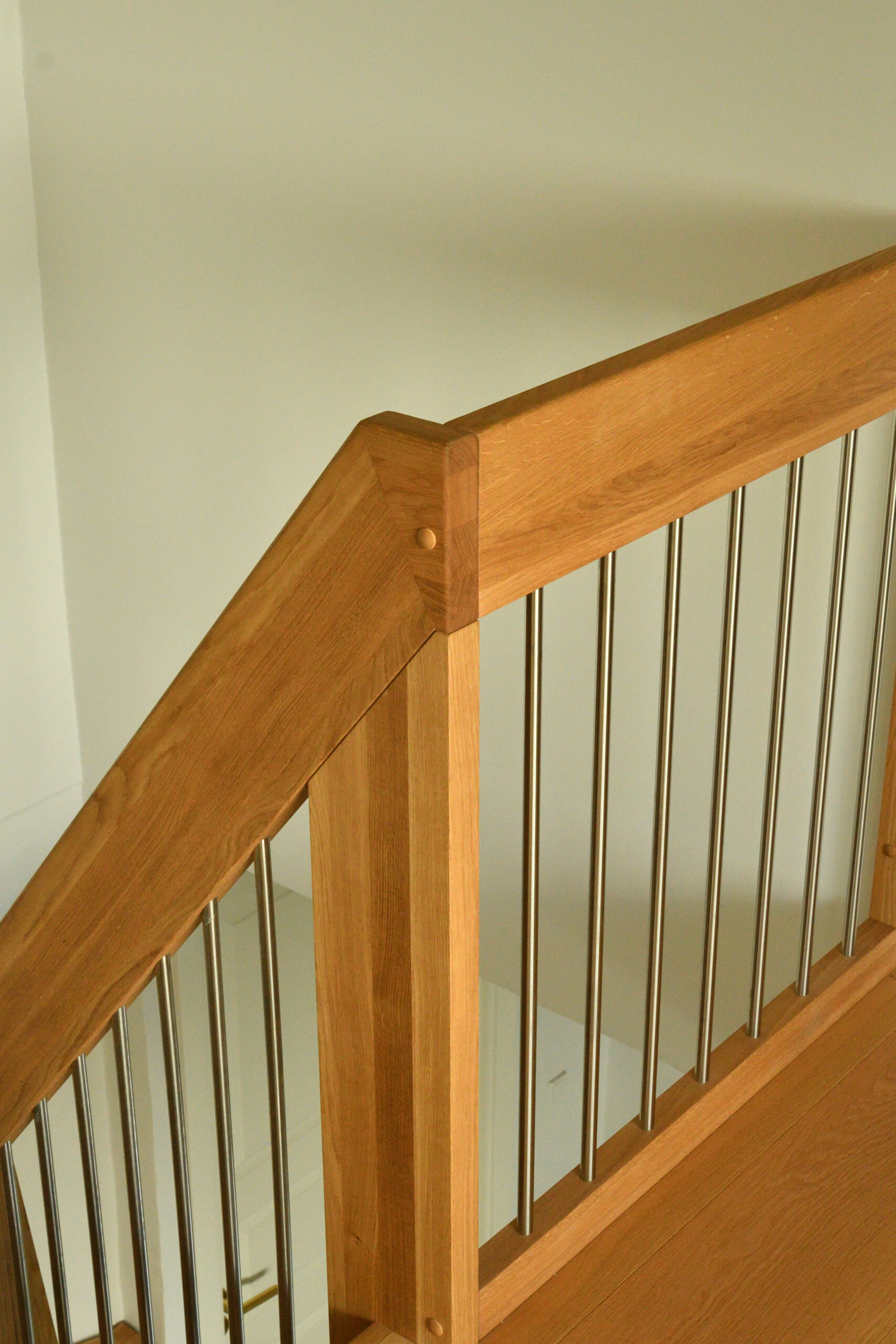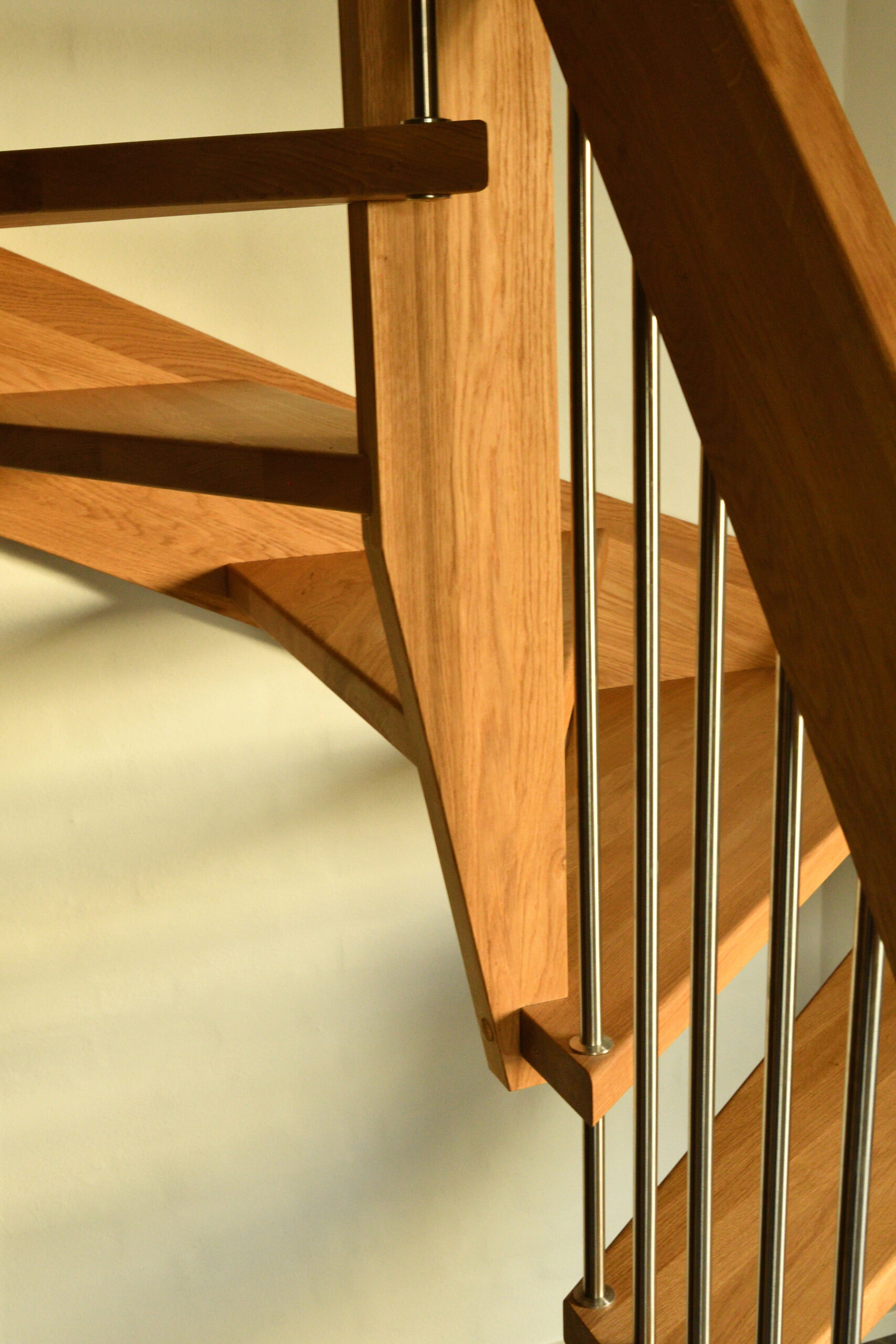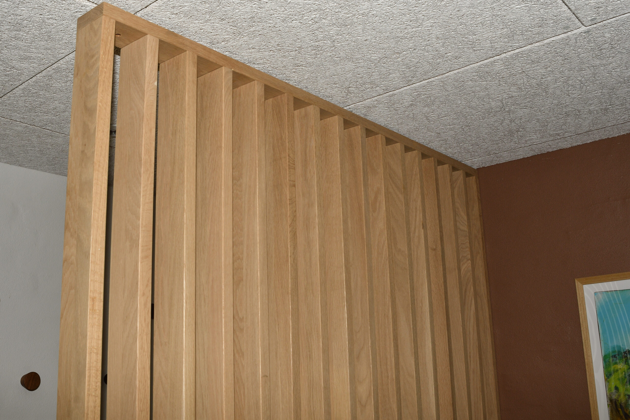 Ingen forvange – trappe som bolt trappe | Bagvange istemt, eg | Trin eg | Håndliste eg | Balustre M16, rustfri stål | Mægler 40 x 160 mm, eg | Lamelvæggen giver trappen karakter og rummet kant. Den skaber en naturlig opdeling uden at virke tung – som en form for diskret afskærmning, der samtidig tilfører noget særligt til helhedsindtrykket. | (Ref. 285589)