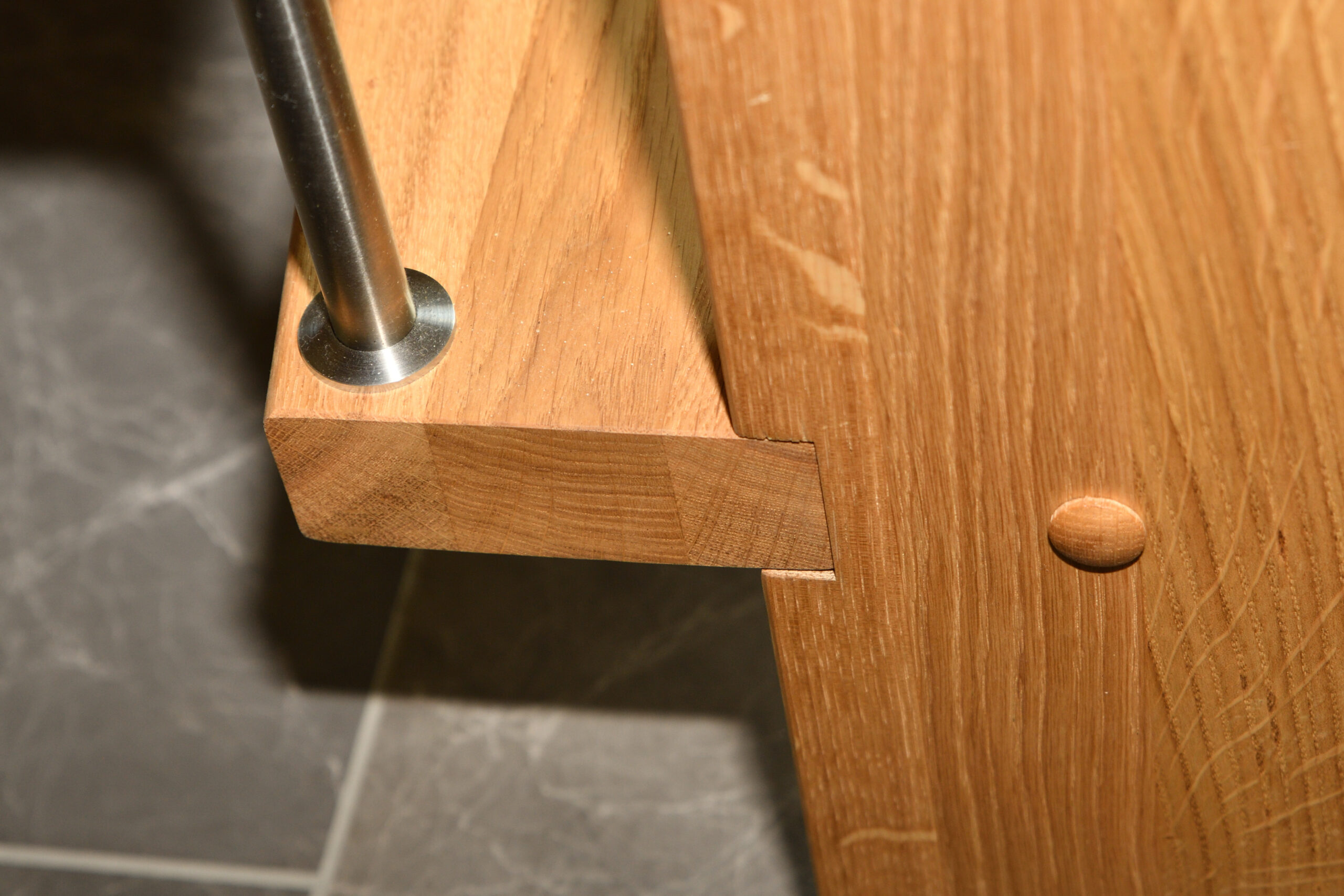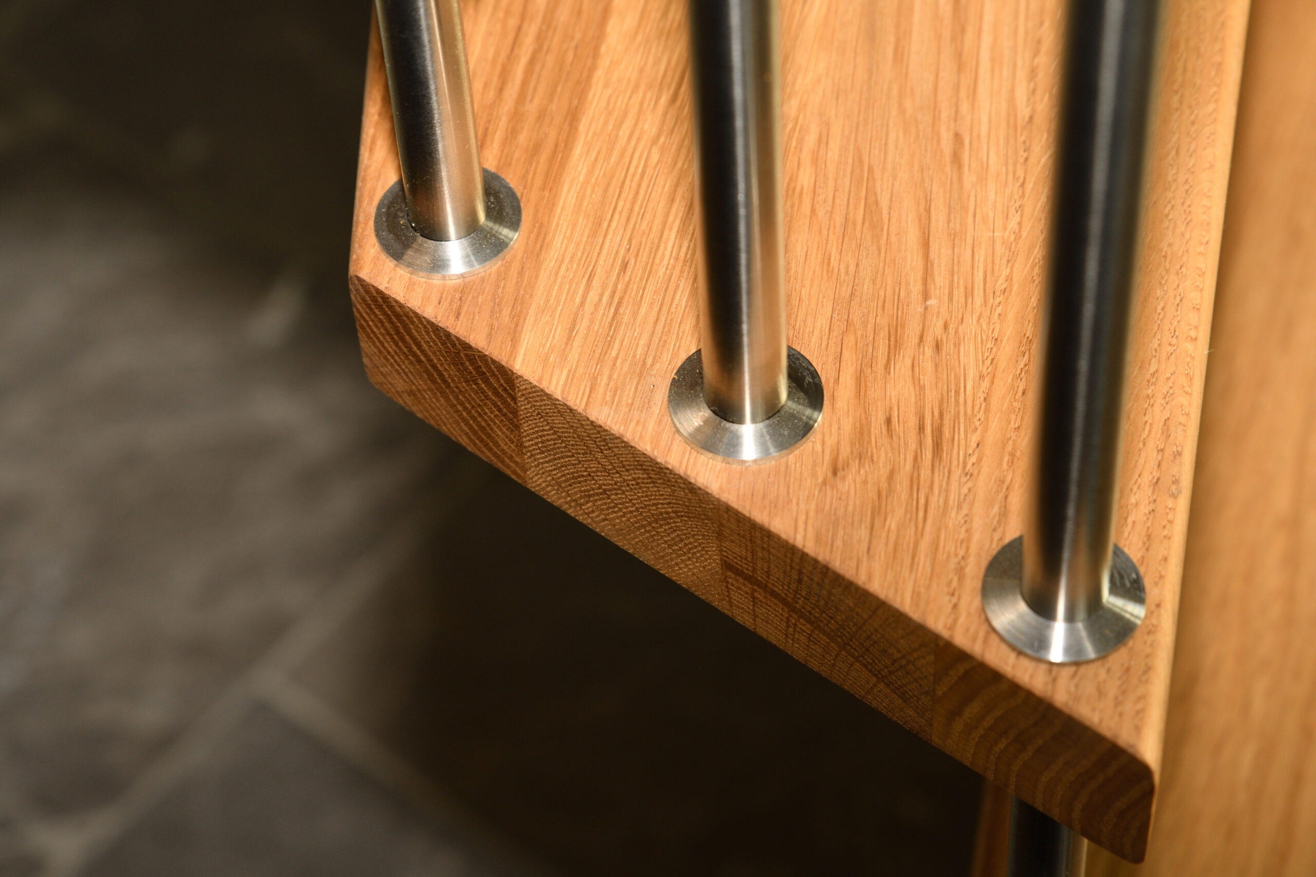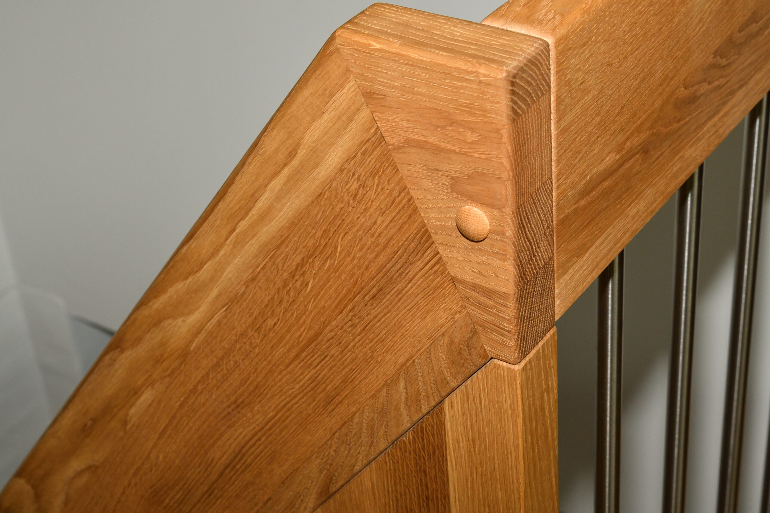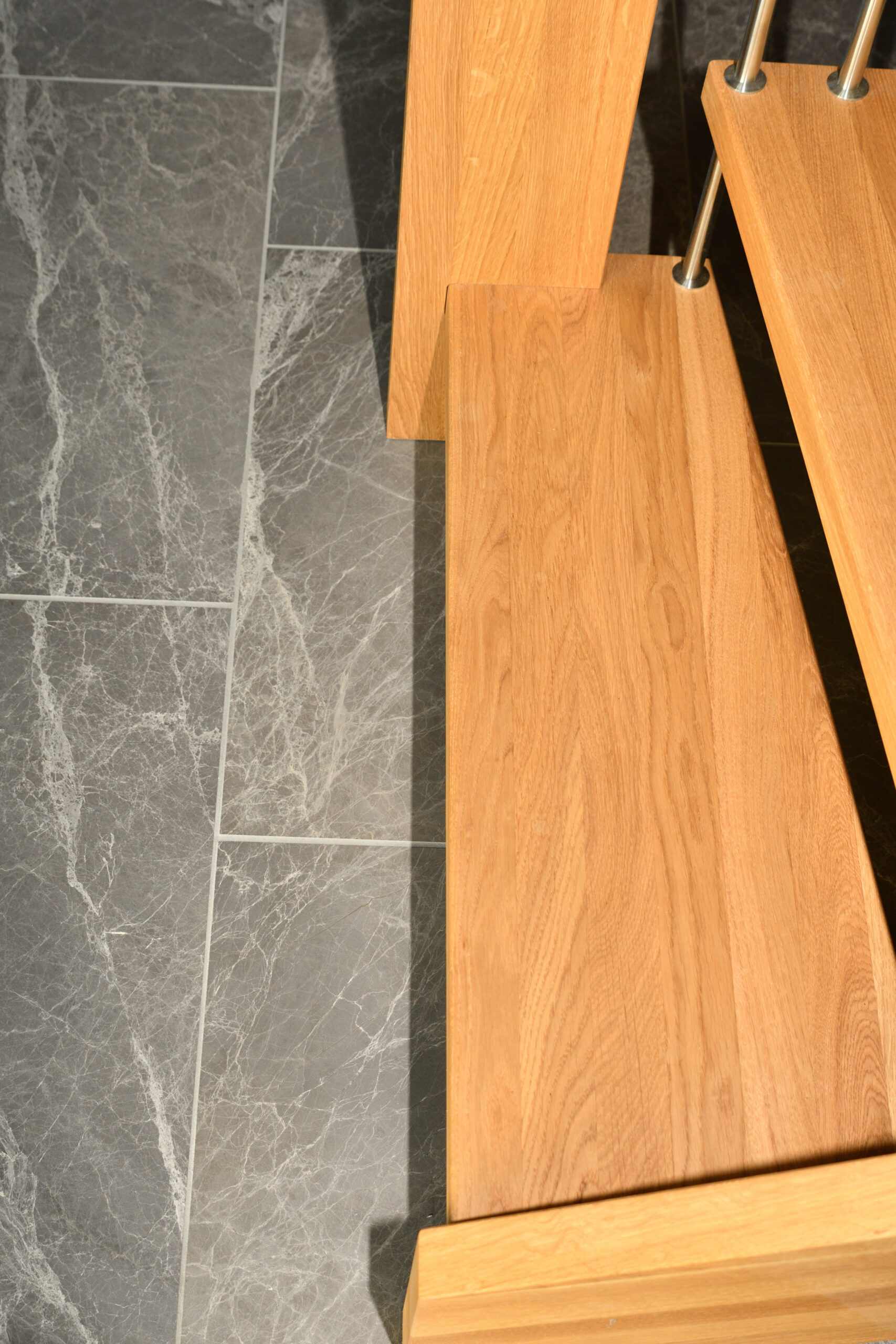 Ingen forvange – trappe som bolt trappe | Bagvange istemt, eg | Trin eg | Håndliste eg | Balustre M16, rustfri stål | Mægler 40 x 160 mm, eg | Lamelvæggen giver trappen karakter og rummet kant. Den skaber en naturlig opdeling uden at virke tung – som en form for diskret afskærmning, der samtidig tilfører noget særligt til helhedsindtrykket. | (Ref. 285589)