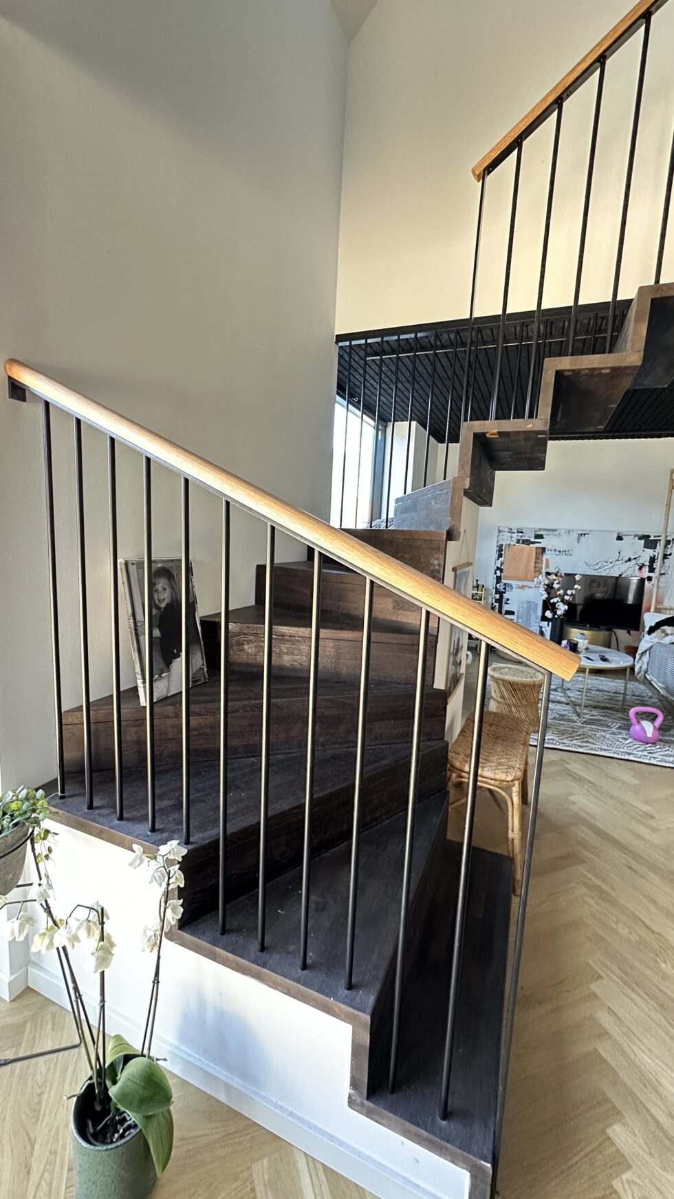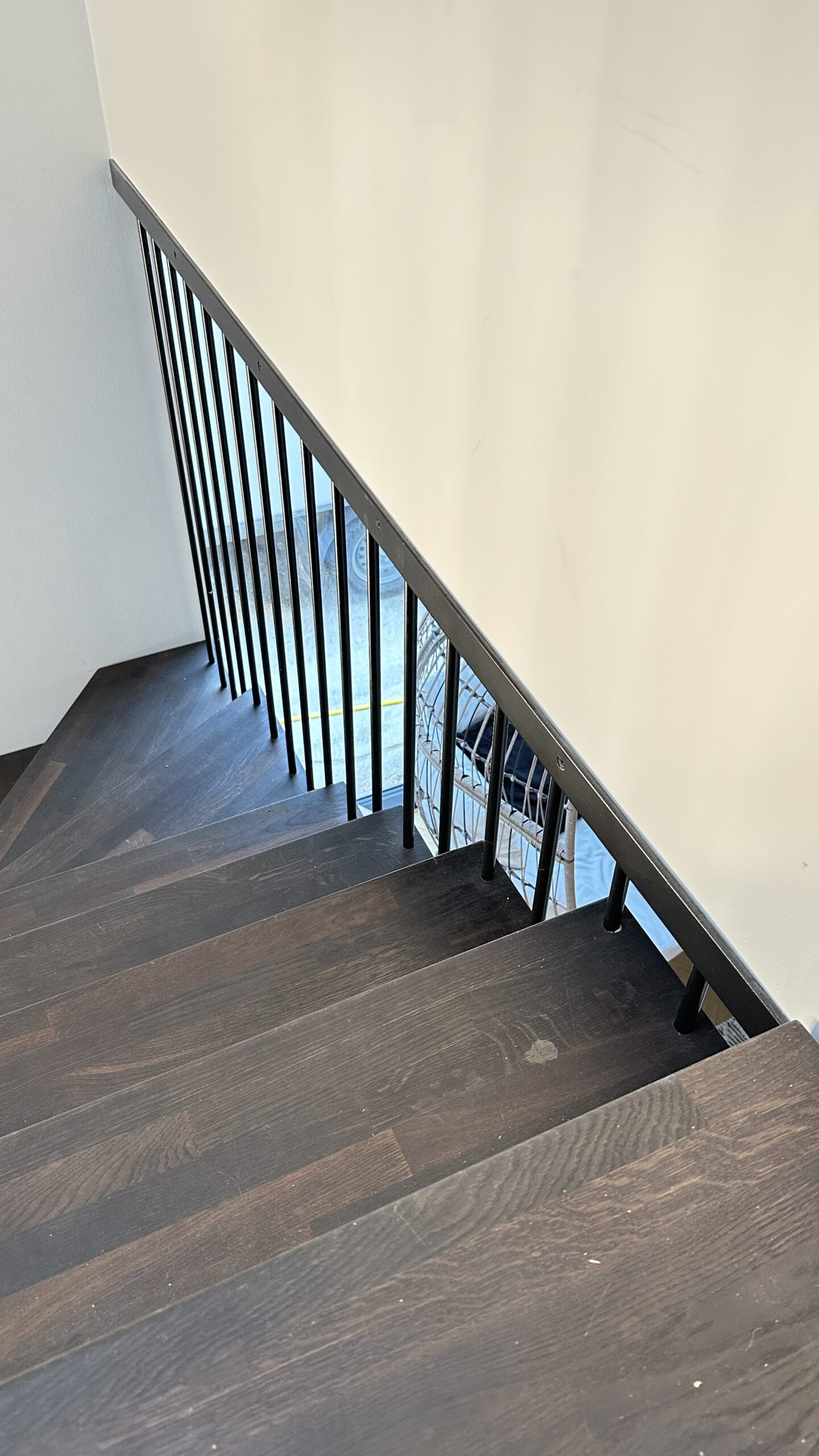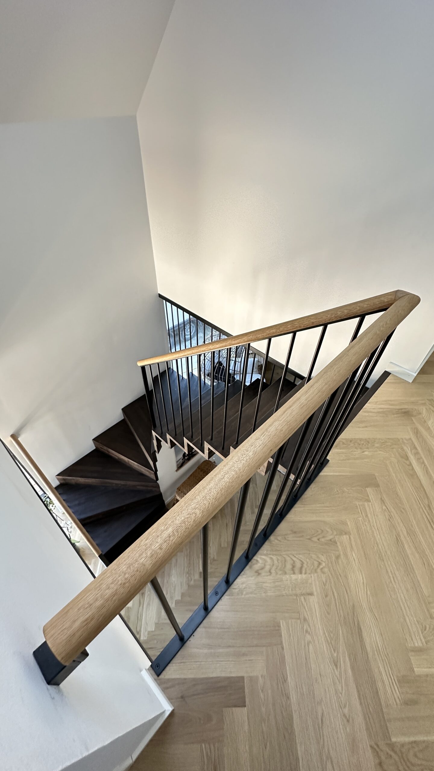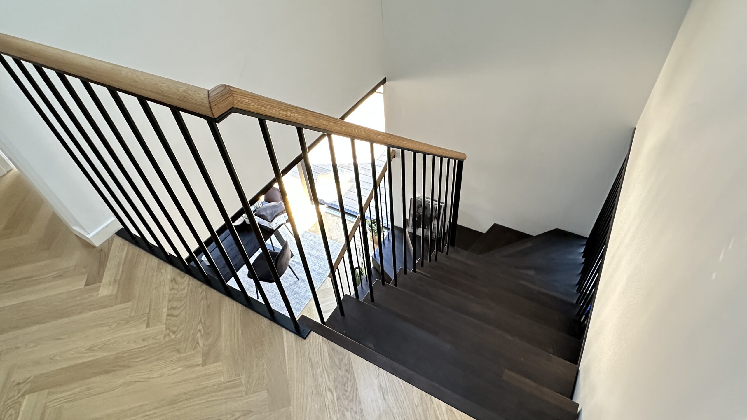 Trappe uden vange på løb 3 | Lukket med glat prop under trin | Trin og stødtrin i sort eg parket 40mm – samlet med gennemgående bolt | Balustre M16 stål sort med fladjern i top | Håndliste H6 flad bund eg | Opsadlet vanger under løb 1 og 2 fyr ubehandlet | (Ref. 136631)