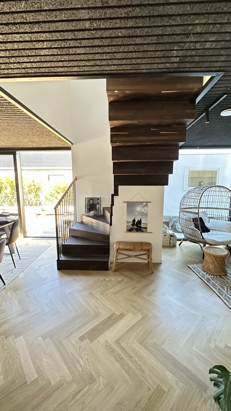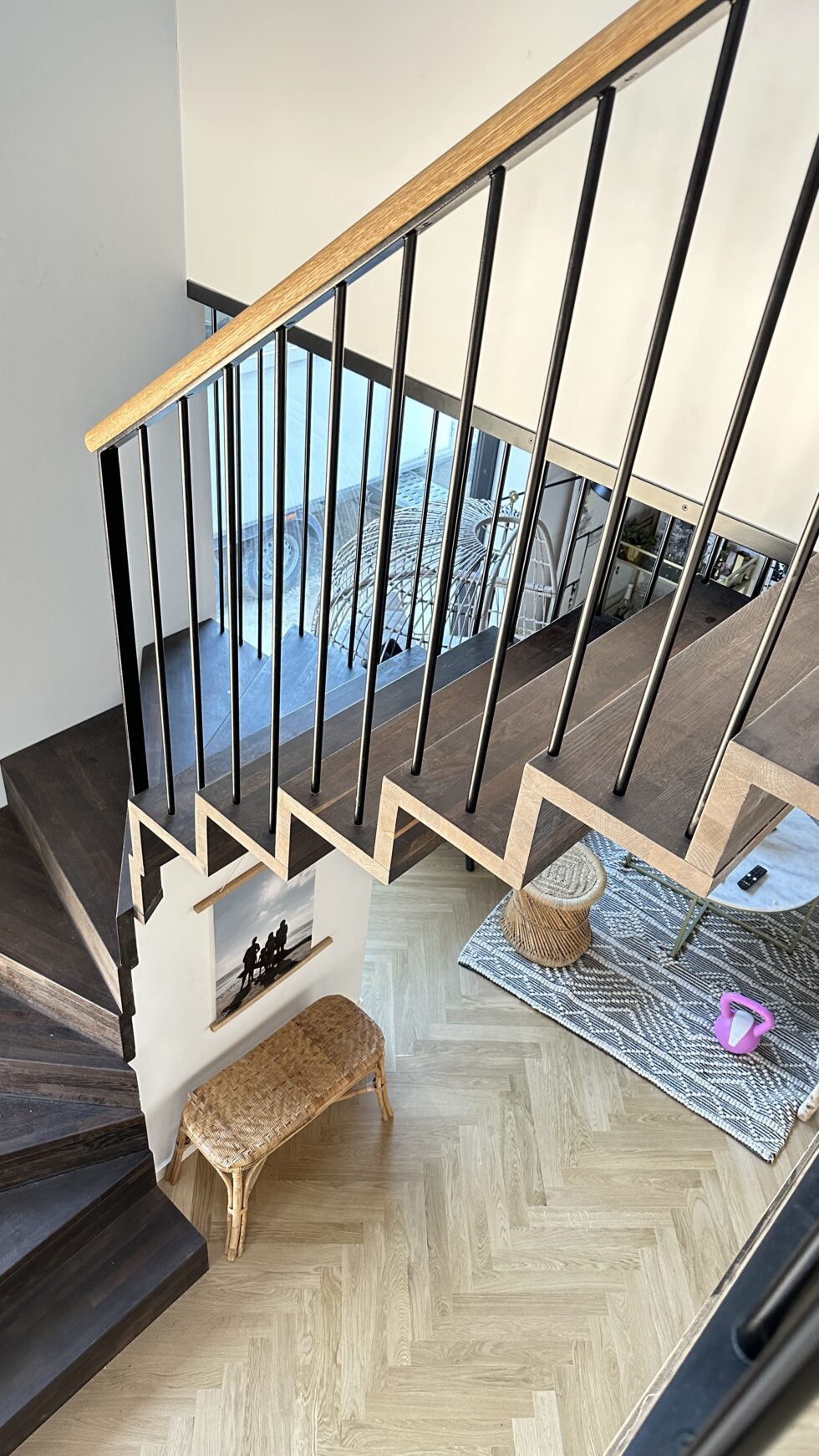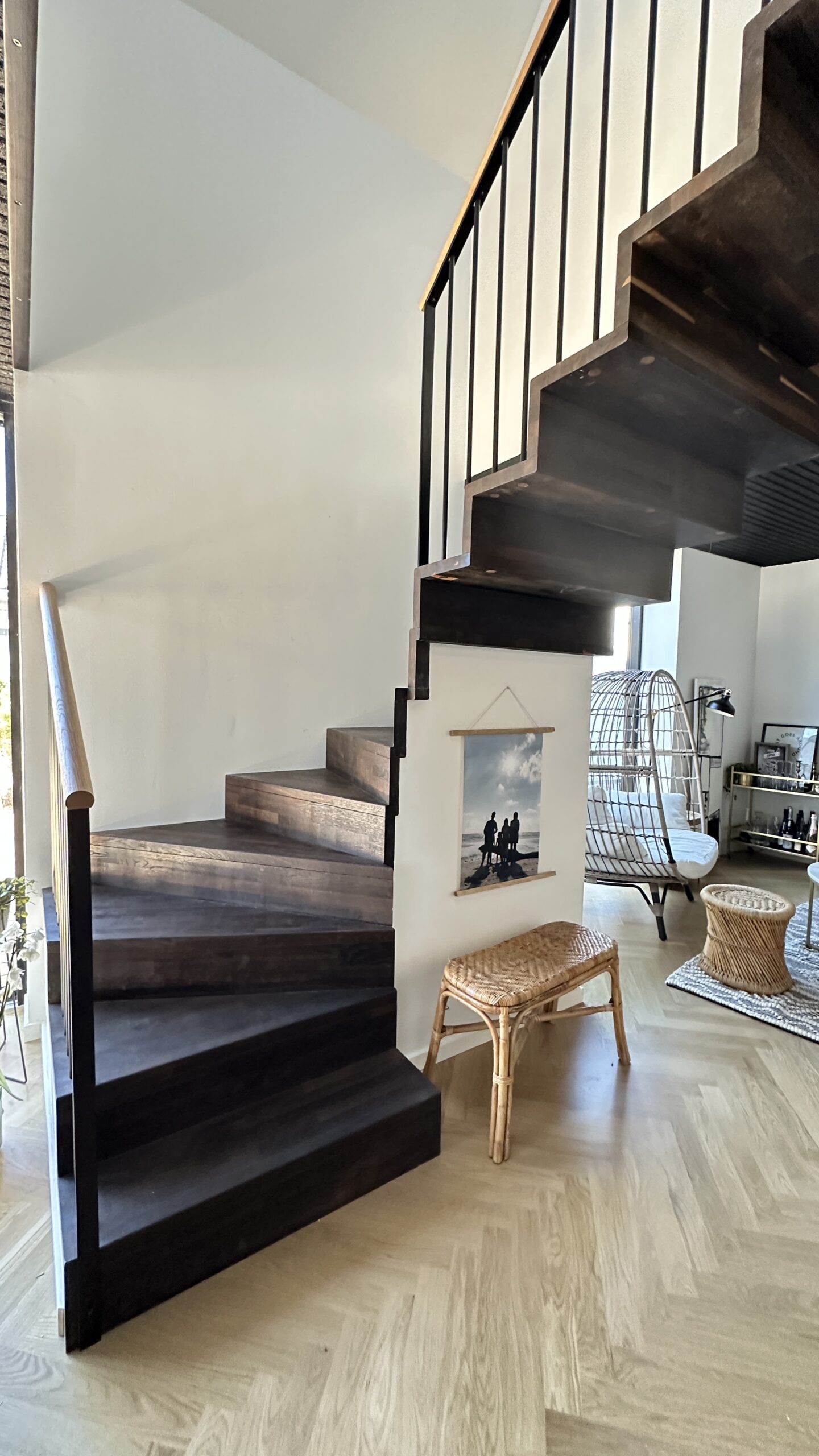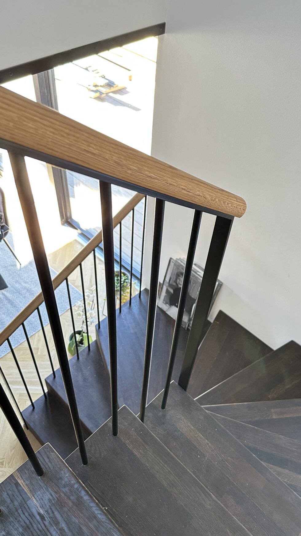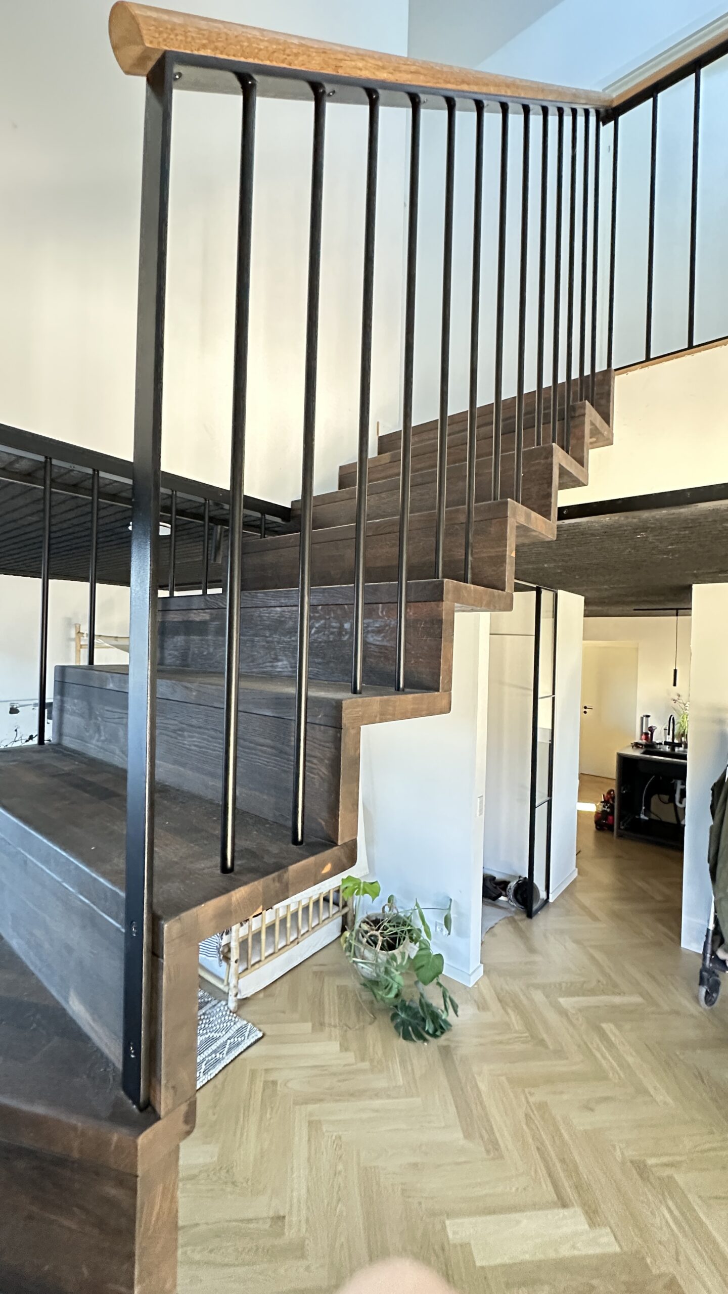 Trappe uden vange på løb 3 | Lukket med glat prop under trin | Trin og stødtrin i sort eg parket 40mm – samlet med gennemgående bolt | Balustre M16 stål sort med fladjern i top | Håndliste H6 flad bund eg | Opsadlet vanger under løb 1 og 2 fyr ubehandlet | (Ref. 136631)