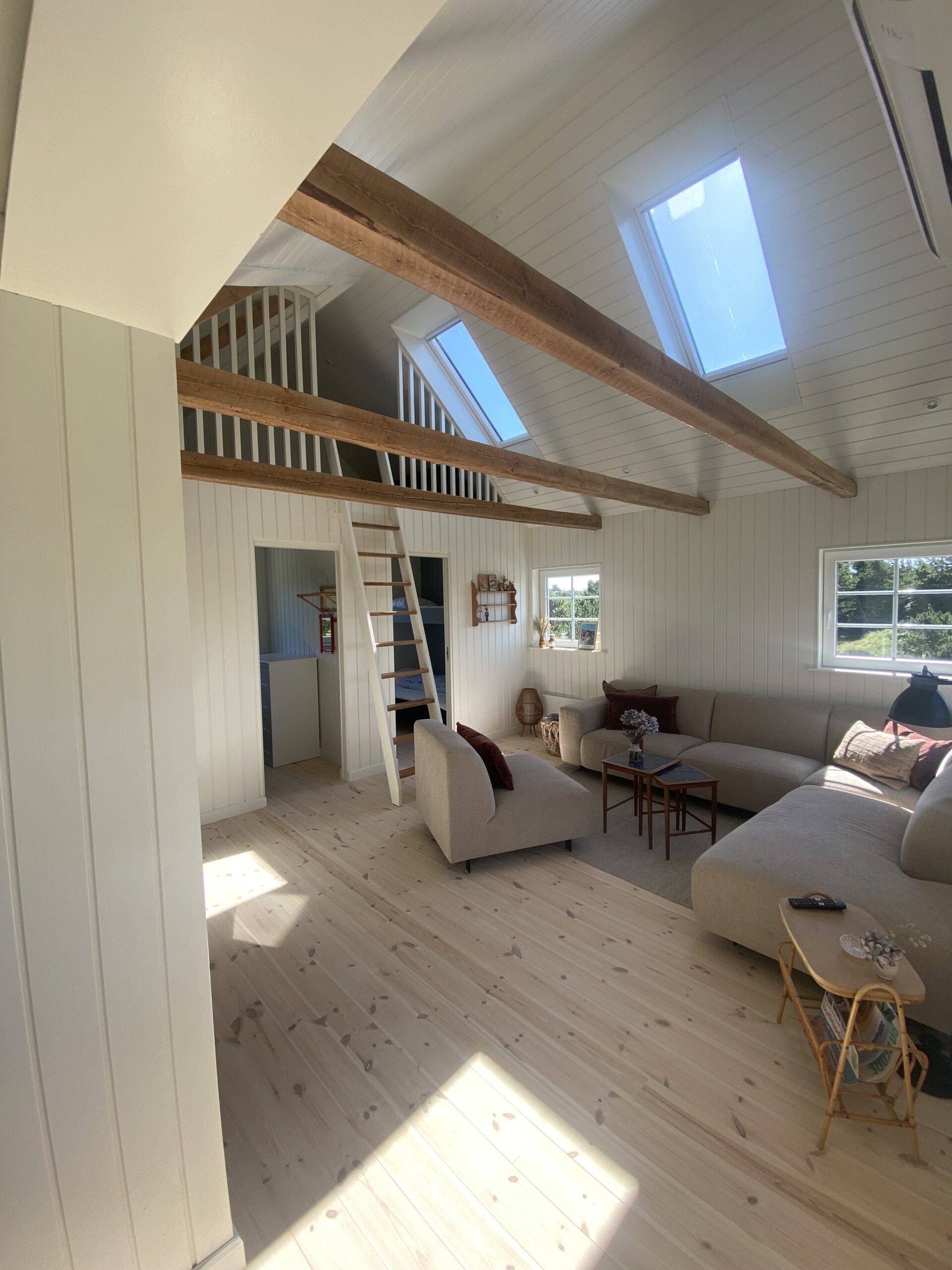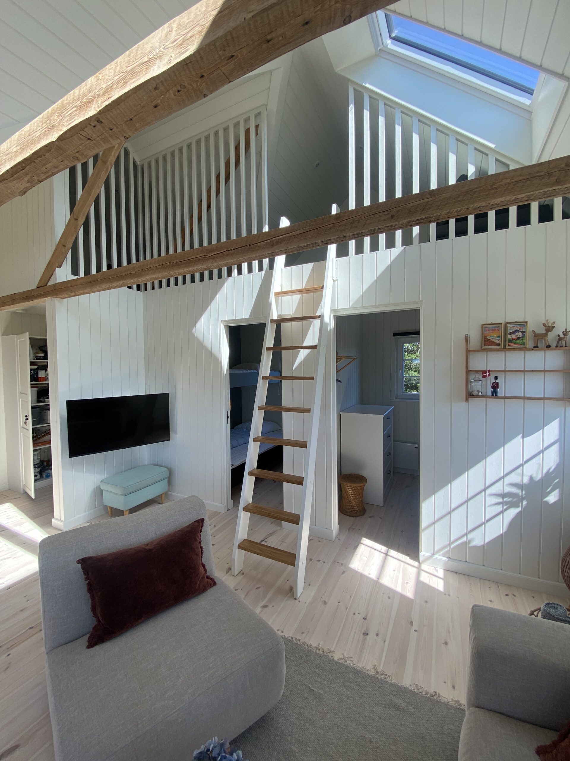 Vanger istemt, hvidmalet | Trin i eg | Med udtræksbeslag så trappen kan trækkes ud, når den er i brug og stå lodret op ad væggen, når den ikke bruges.