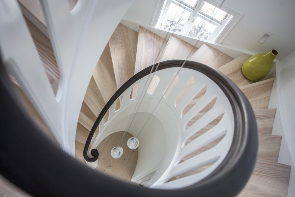 Vanger istemt og buet forvanger, hvidmalet og med skjult skruning i forvange | Trin i douglas med gennemgående stave | Håndliste H5, løvtræ sortmalet | Pladegelænder / M22 Balustre | Start med 180 grader startmæglere og P mægler med kattepote på klodstrin, hvidmalet | Stødtrin i hvid