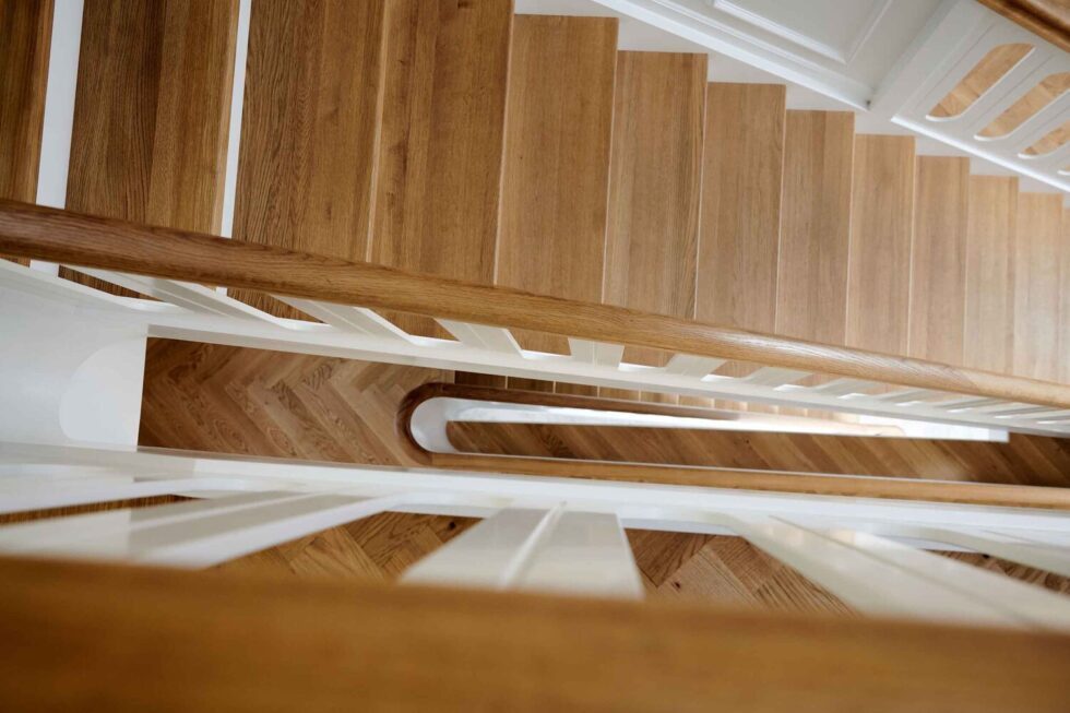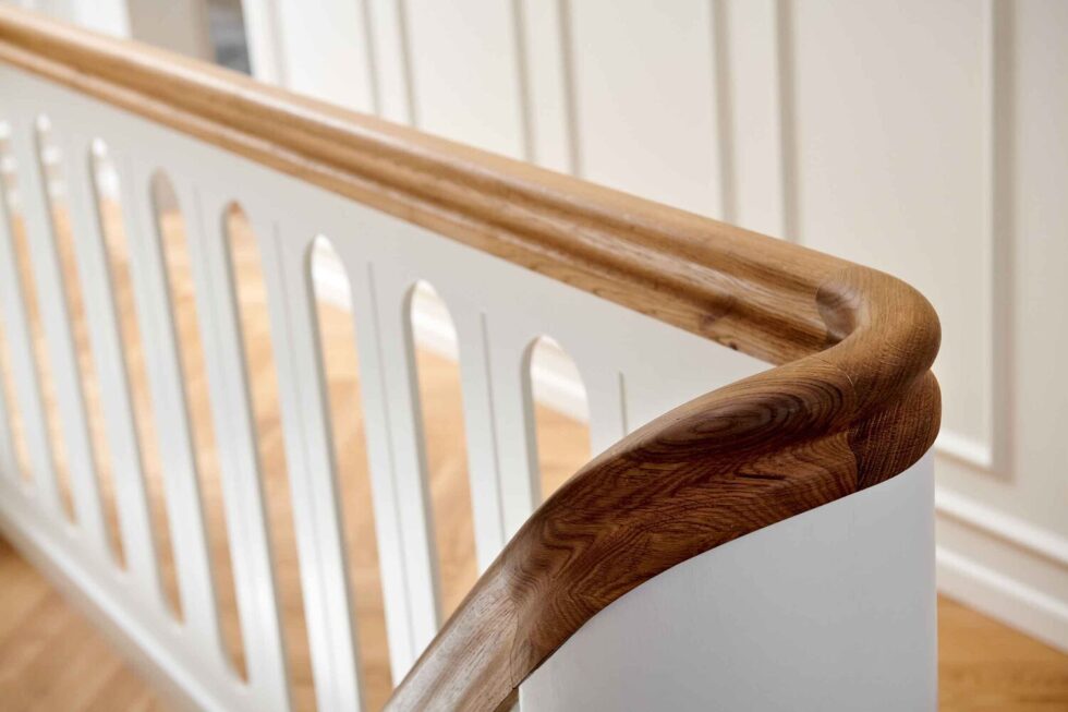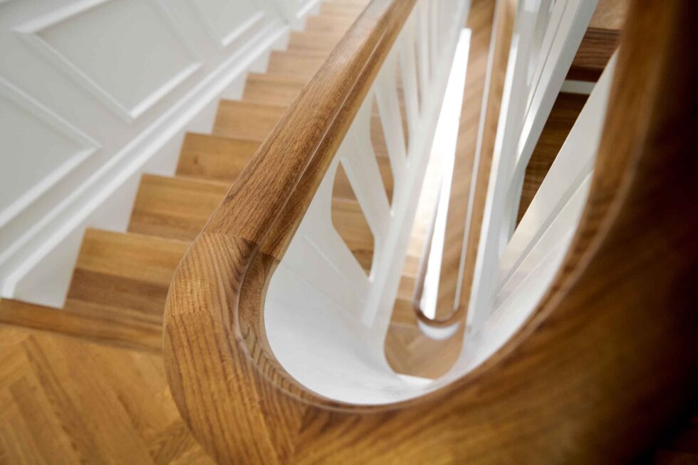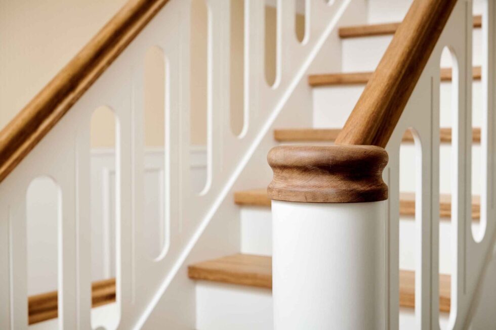 Vanger istemt, hvidmalet og med skjult skruning i forvange | Trin i eg med gennemgående stave | Håndliste H5, eg | Pladegelænder med spor | Gennemgående hovedstykker med ovenpå lagt håndlister | Start Ø120mm mægler med kattepote og klodstrin, hvidmalet | Stødtrin i hvid