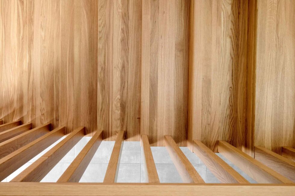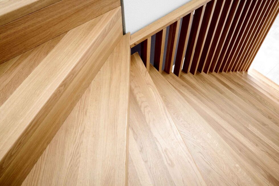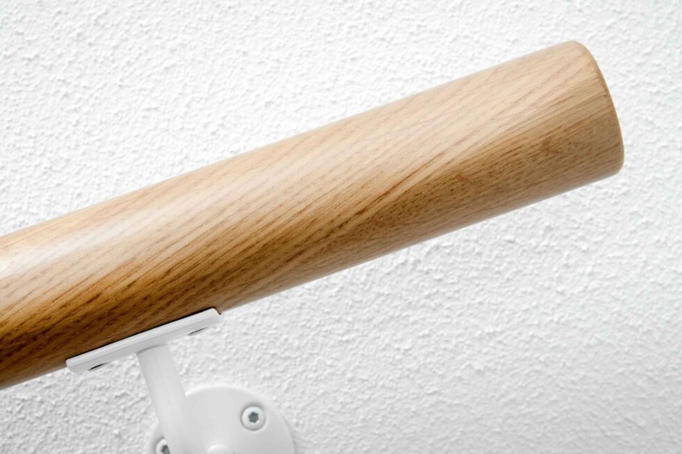 Vange, opsadlet, hvidmalet | Trin i eg | Stødtrin i eg, ligger glat med forkant trin, musetrappe | Væghåndliste Ø43 mm eg, monteret med hvide holdere | Espalier gelænder i eg, til loft