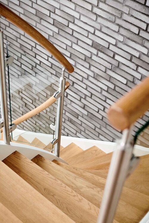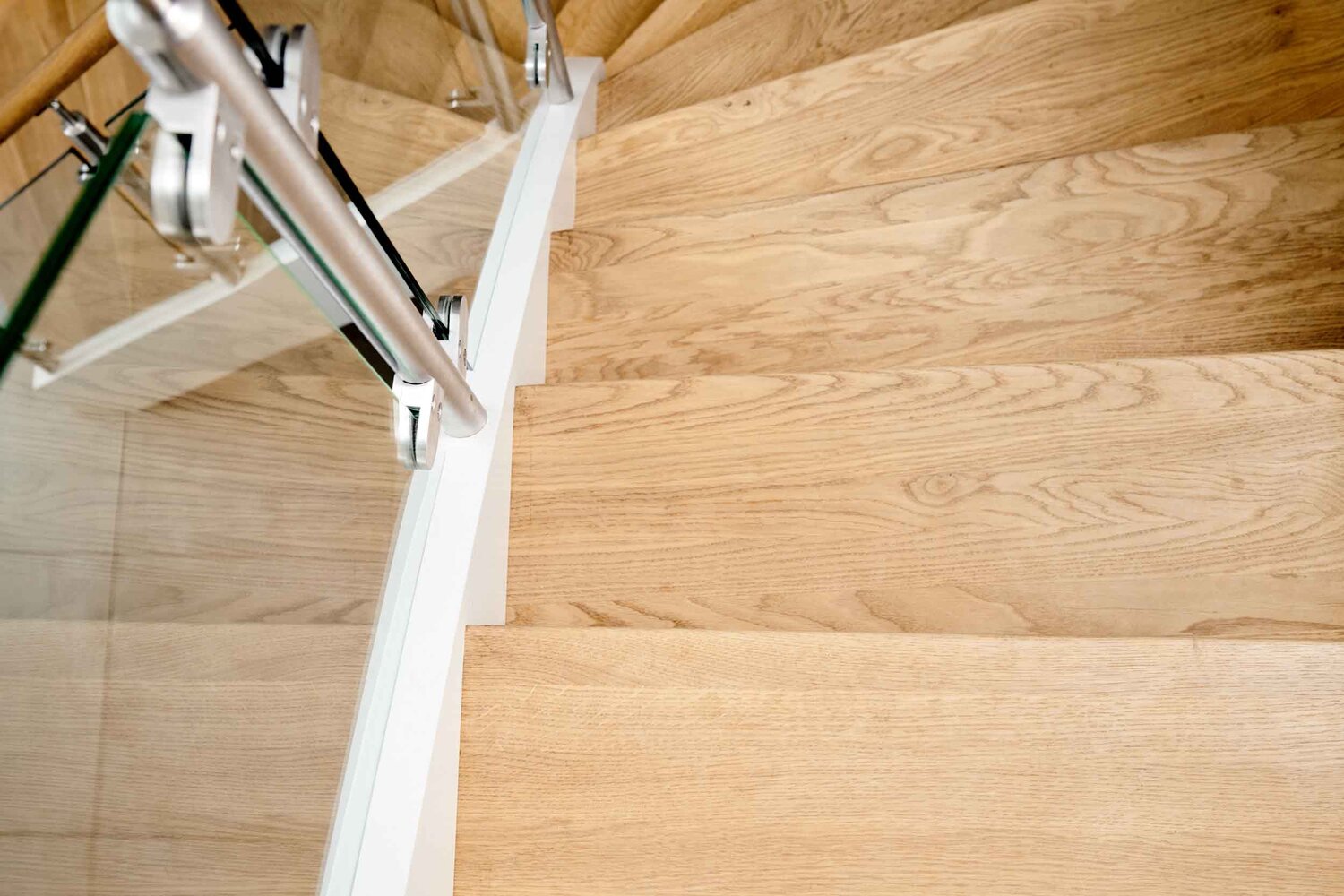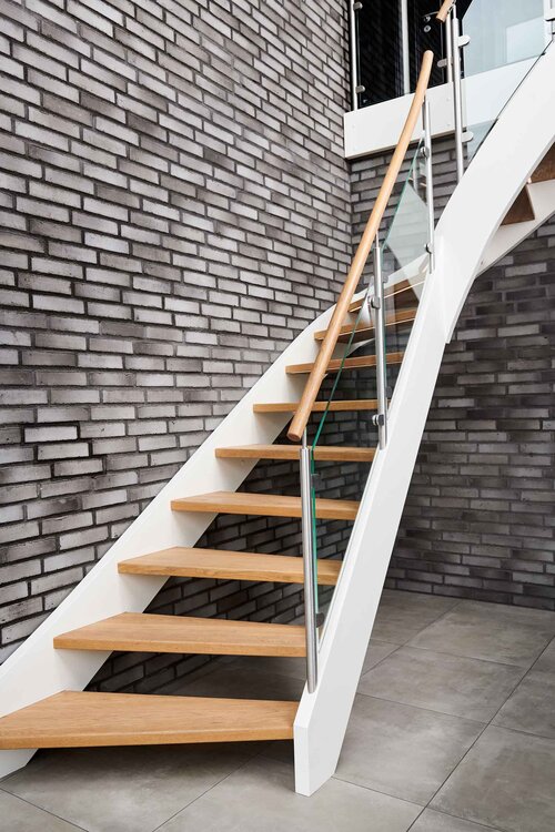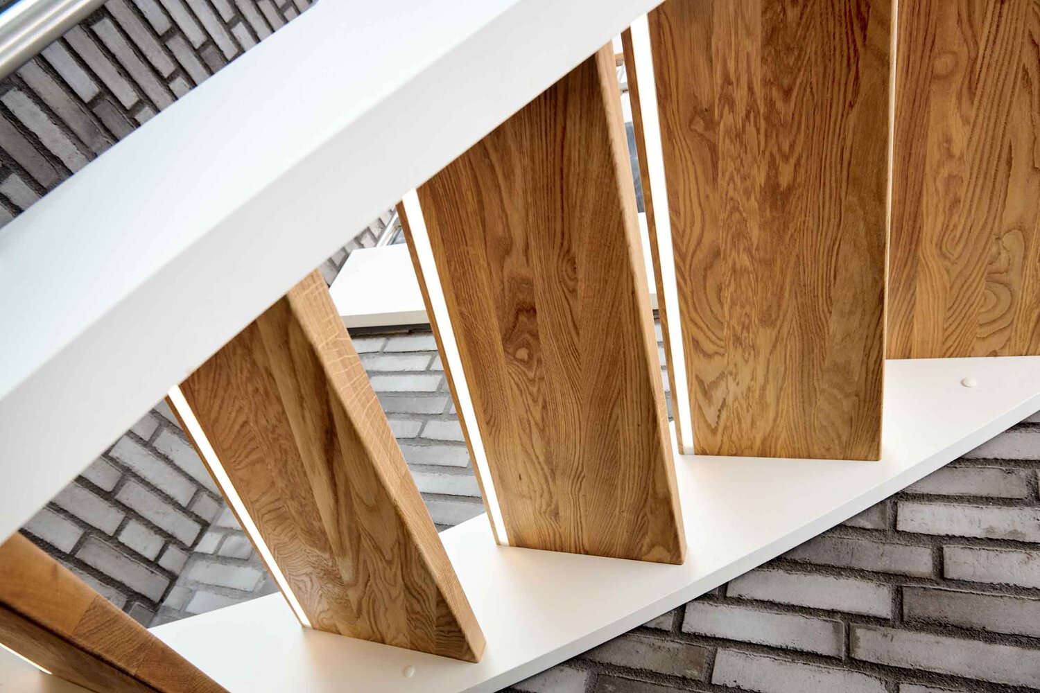 Vanger istemt, hvidmalet | Trin i eg | Håndliste Ø43, eg | 4+4 mm glas gelænder | Mæglere rustfri stål | Skjult skruning (ingen synlige knapper på forvanger) | Trin med LED på undersiden