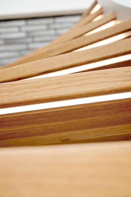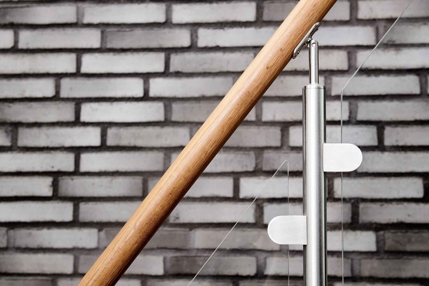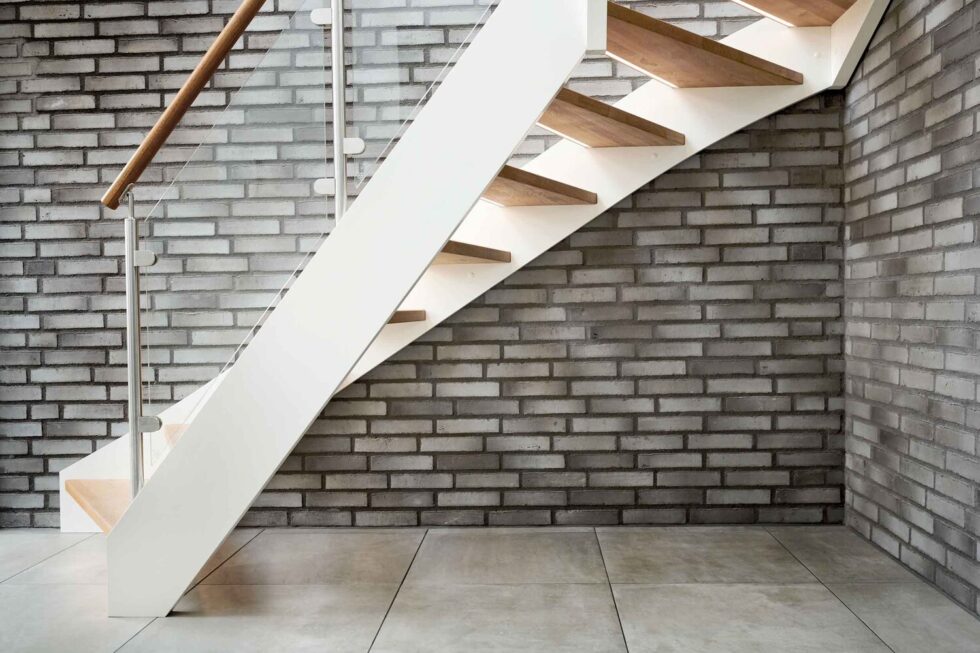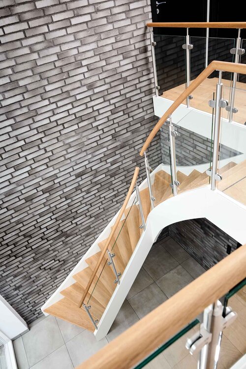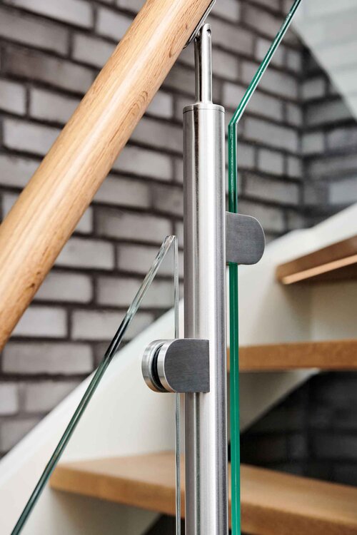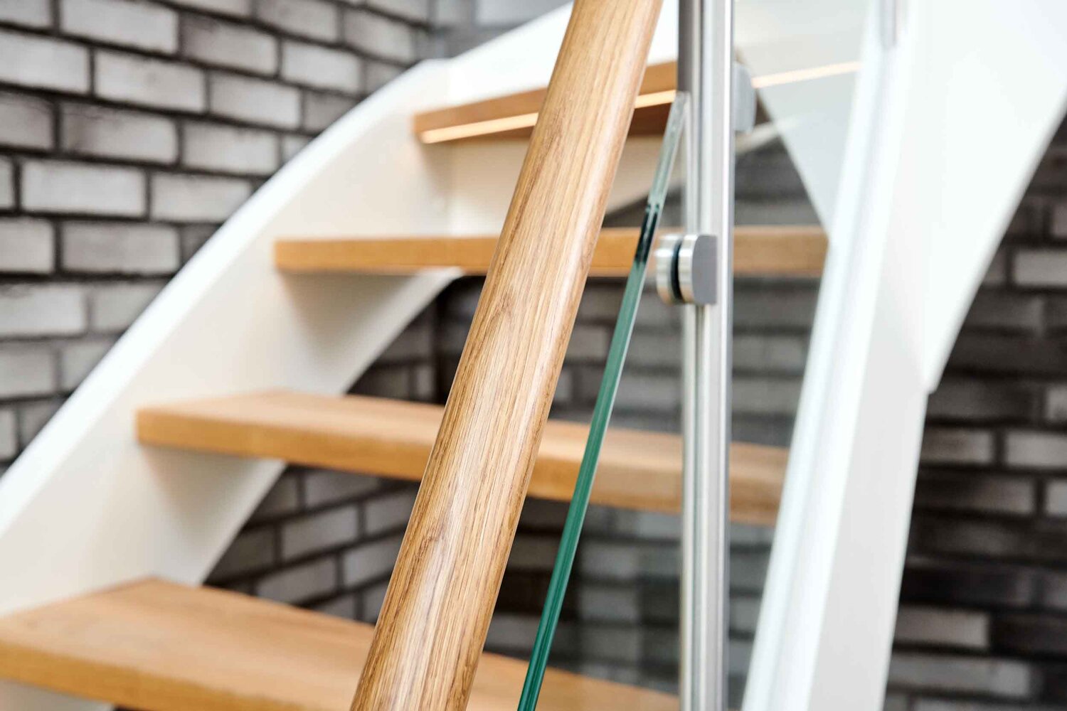 Vanger istemt, hvidmalet | Trin i eg | Håndliste Ø43, eg | 4+4 mm glas gelænder | Mæglere rustfri stål | Skjult skruning (ingen synlige knapper på forvanger) | Trin med LED på undersiden