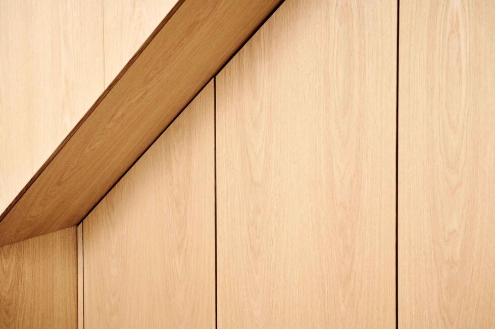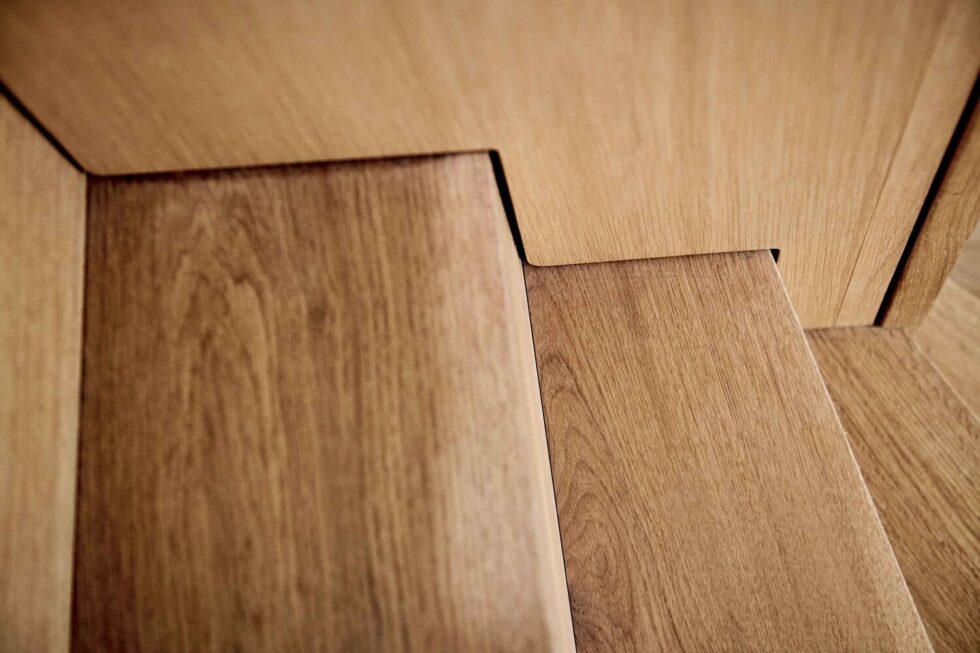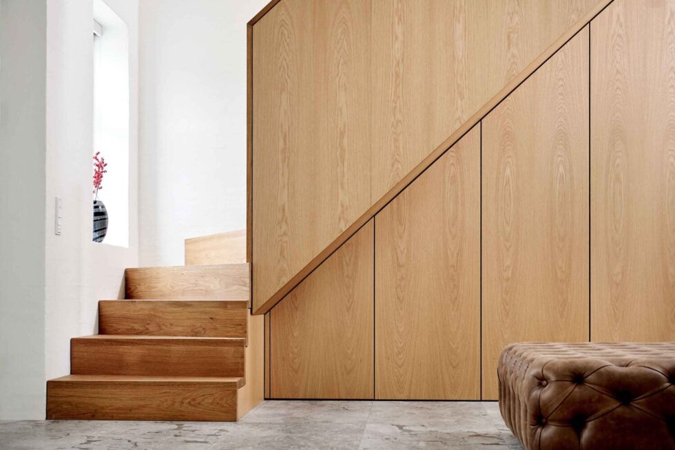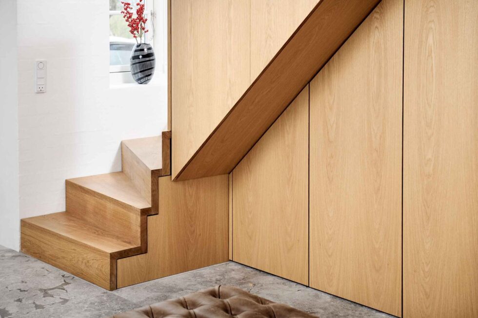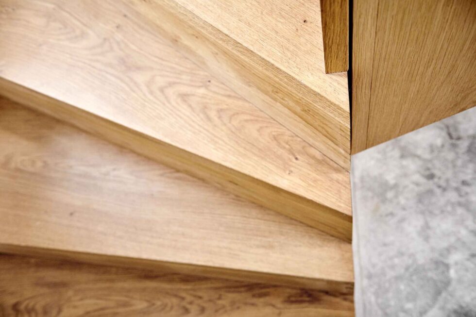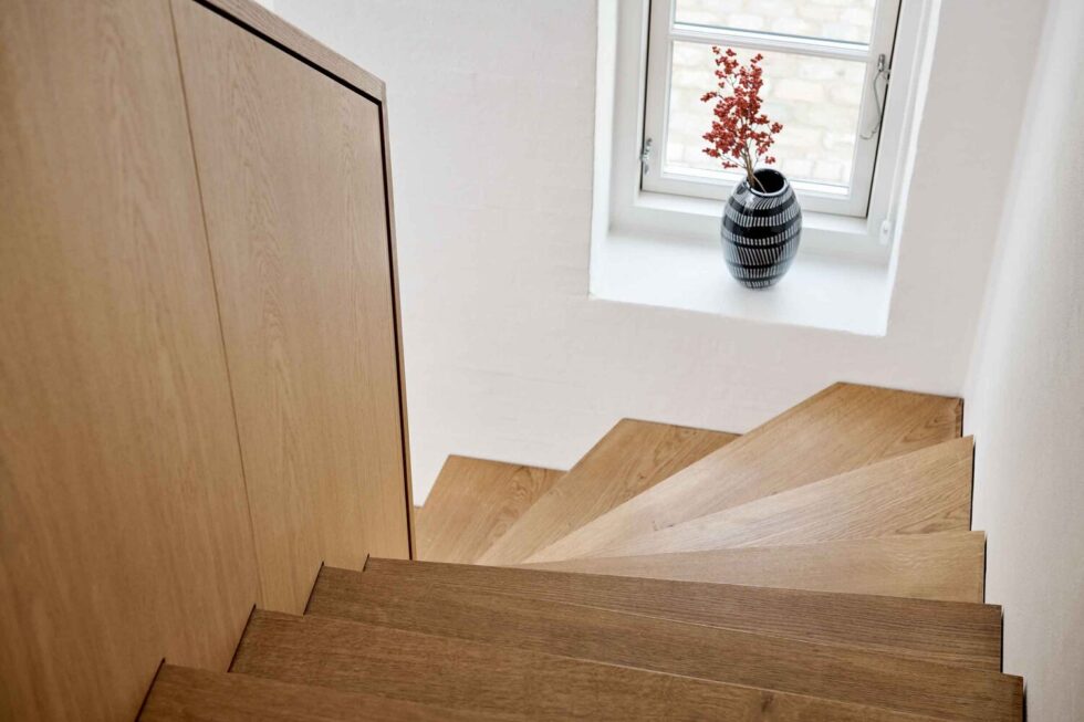 Vanger opsadlet, eg/fyr | Trin i eg helparket | Stødtrin i eg helparket, ligger glat med forkant trin, musetrappe | Skabsvæg/gelænder, eg finer med massiv eg håndliste på toppen | (Ref: 290243)