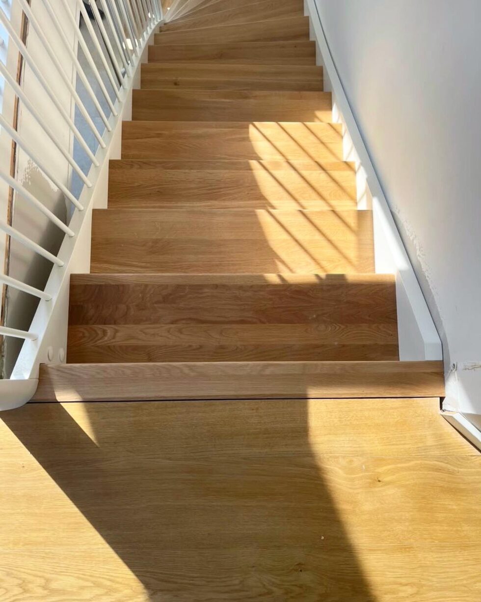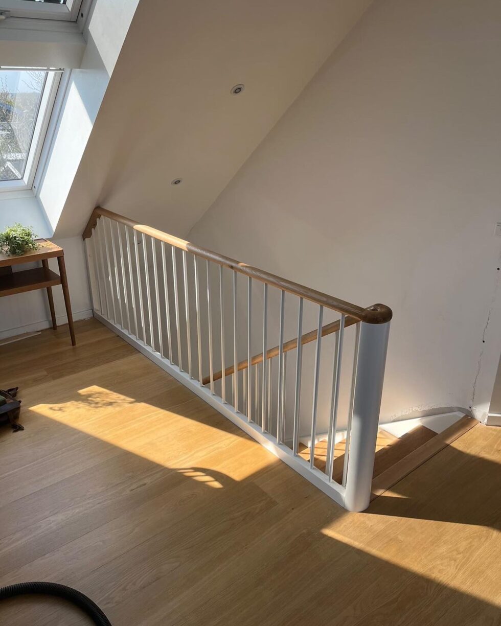 Hvide vange med skjult skruning i forvange | Håndliste H6 flad ført til gulv i oliebehandling eg (Type A) | Trin i massiv eg, oliebehandlet | Hvide stødtrin | Balustre M16 hvidmalet stål | (Ref: 134495)