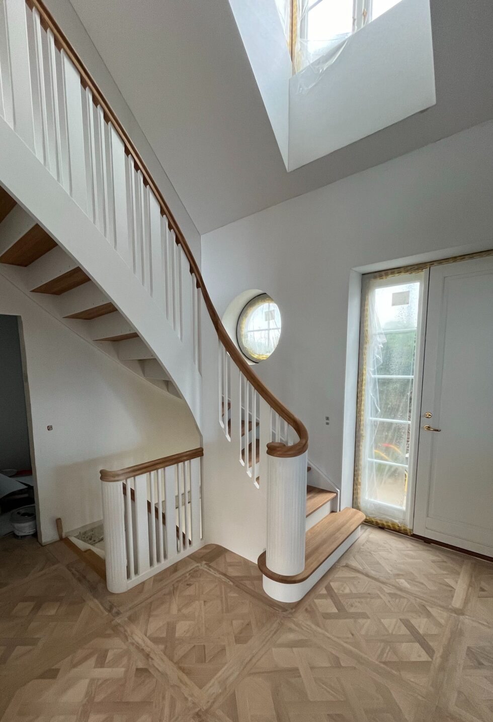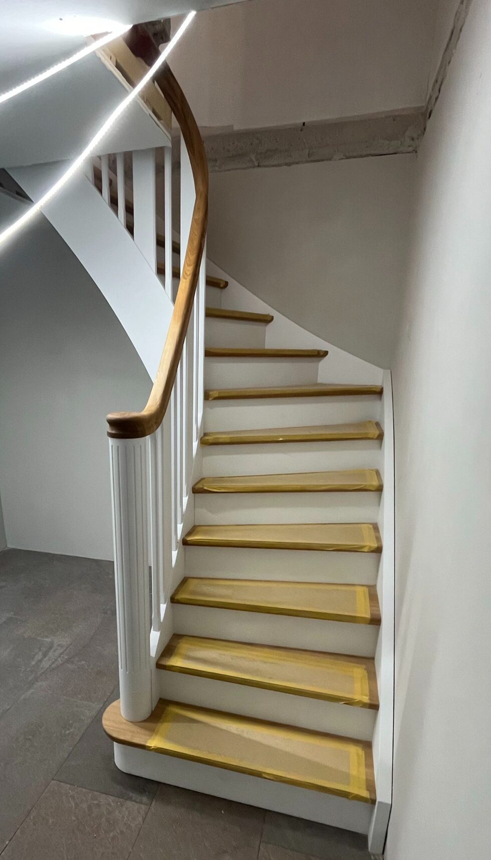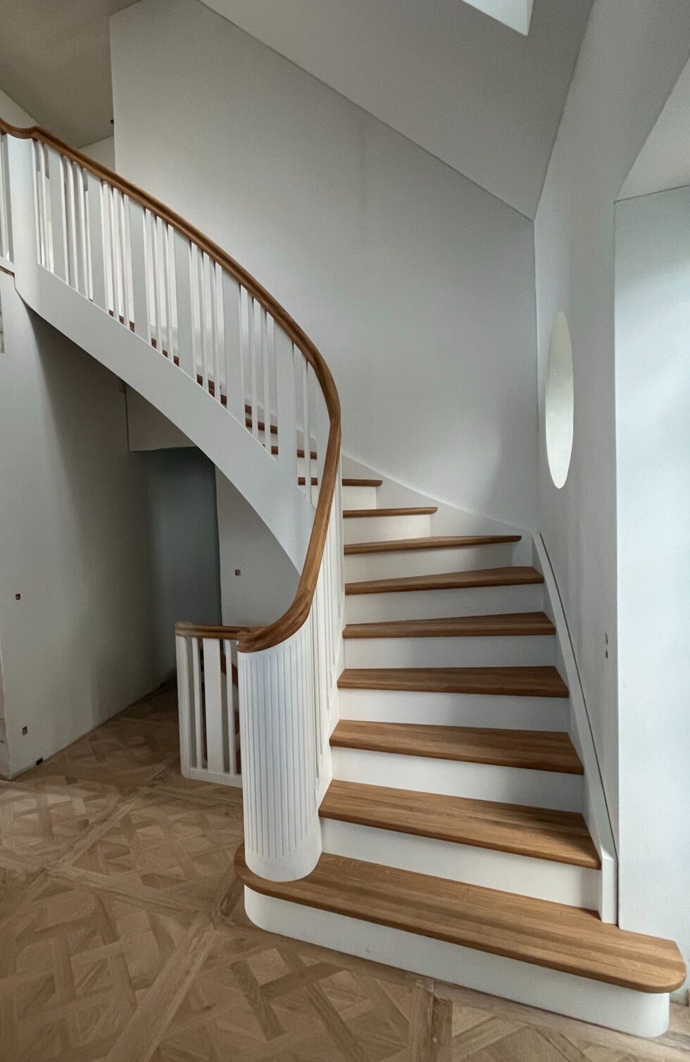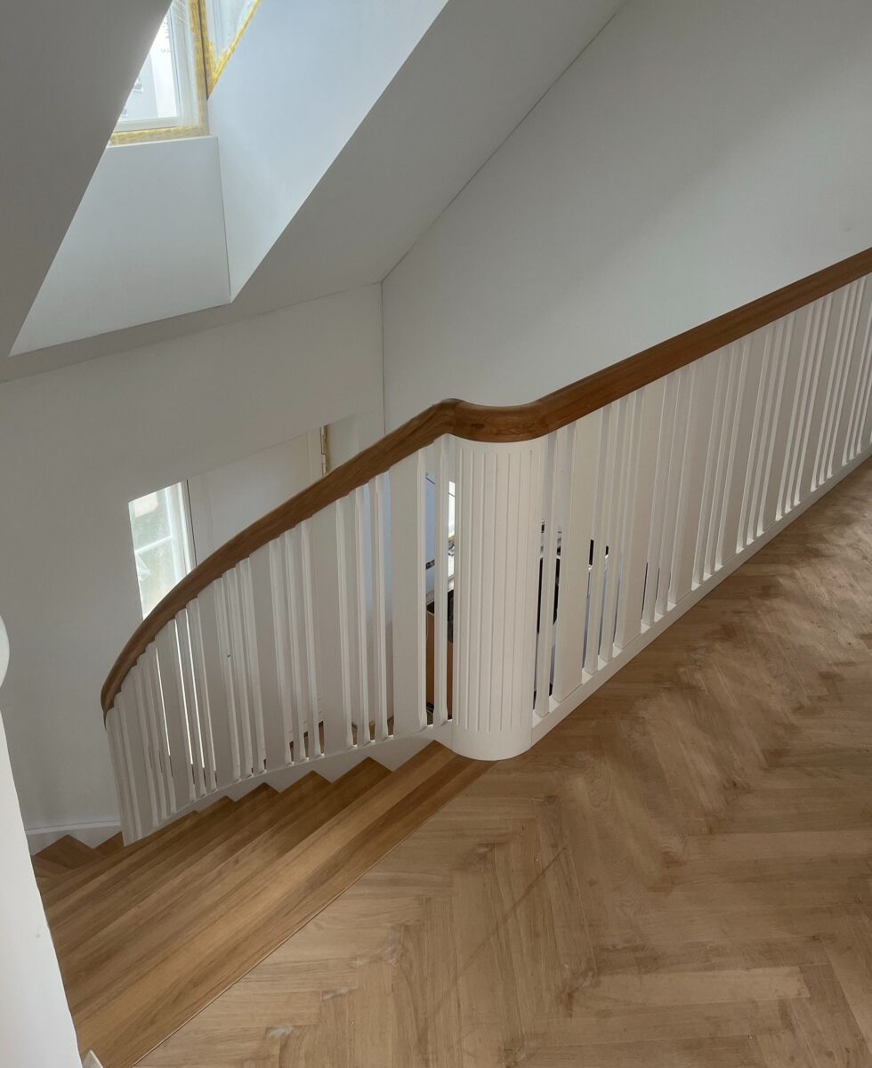 Vange istemt hvidmalet med skjult skruning | Trin i massiv eg, gennemgående stave | Forkant F5 og olie behandlet | Stødtrin i hvidmalet mdf | Balustre M28 / 100*25mm med profil hvidmalet løvtræ | Håndlister H5 massiv eg oliebehandlet | 180 graders start med P mægler og kattepote samt spor på bloktrin | (Ref: 135008)