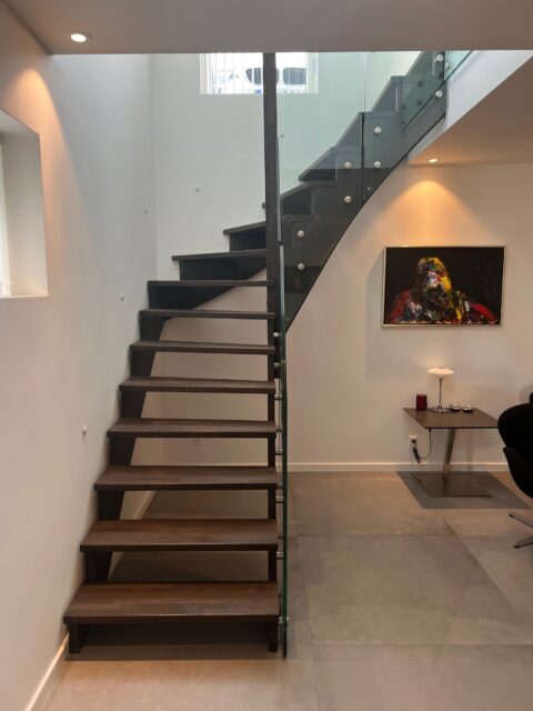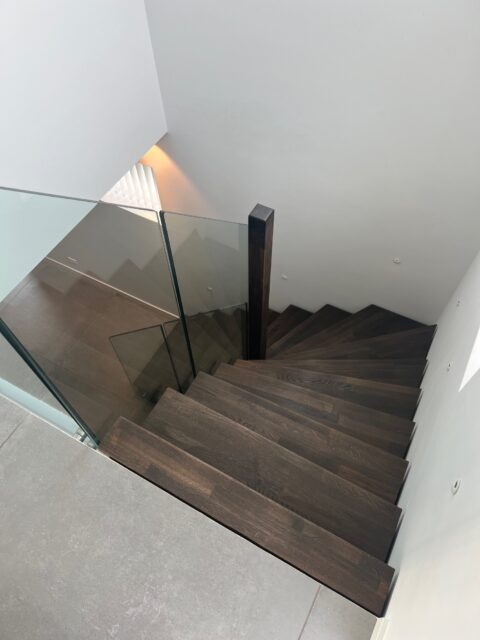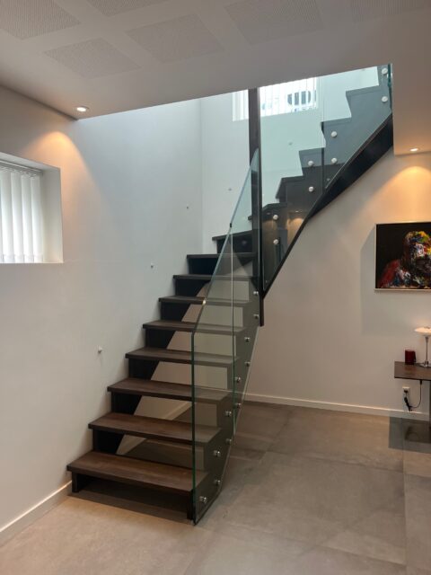 Vanger opsadlet | Trin 40mm massiv sort eg, delte stave | 8+8 mm glas monteret på vanger med rustfri grisetryner | (Ref: 280985)