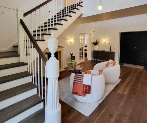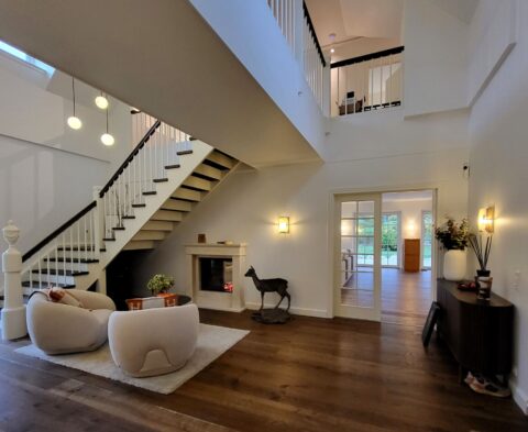 Opsadlet vanger | Trin i 40mm eg, sortolieret | Hvide stødtrin | Håndliste H5 eg, sortolieret | Balustre M22 hvid | Start mægler genbrugt fra gammel trappe | Øvrige mæglere type L | (Ref: 134704)