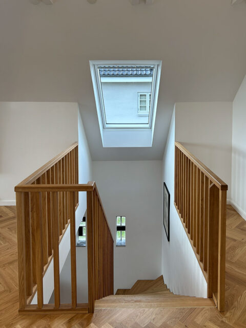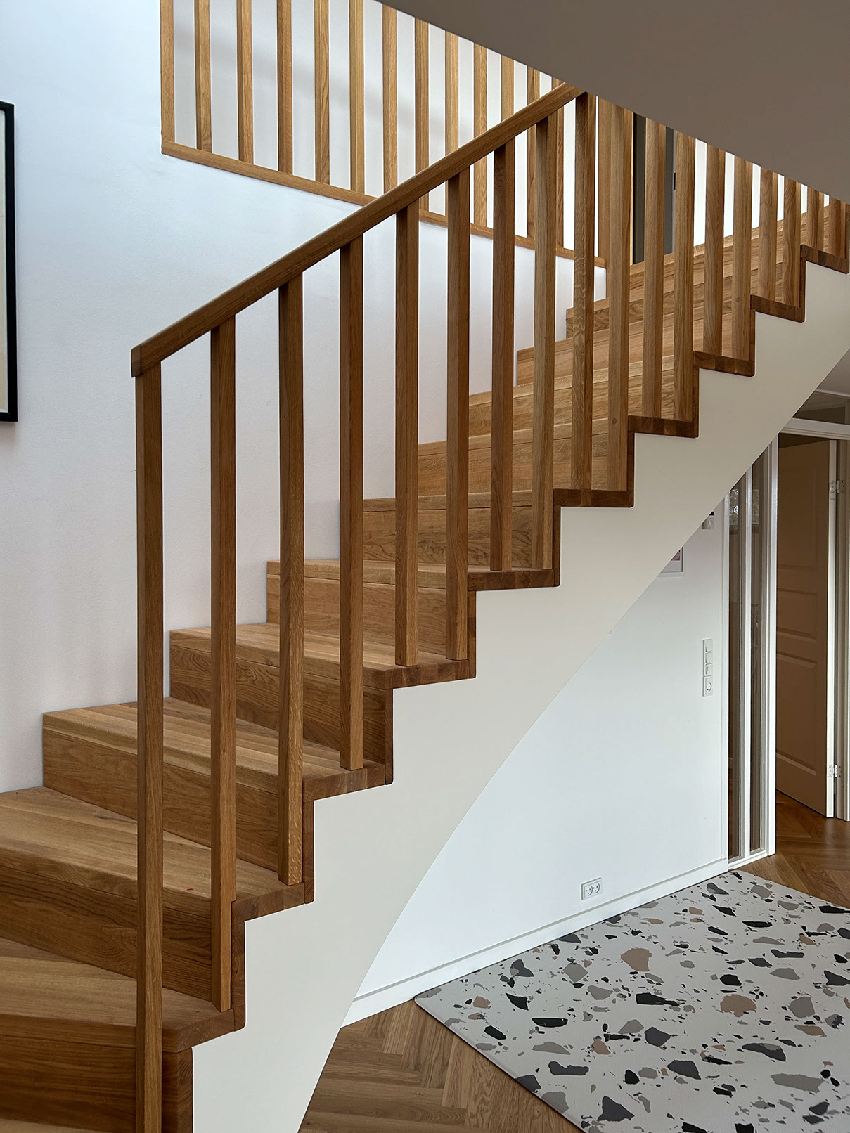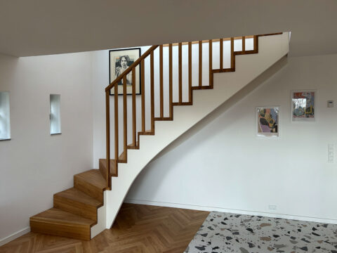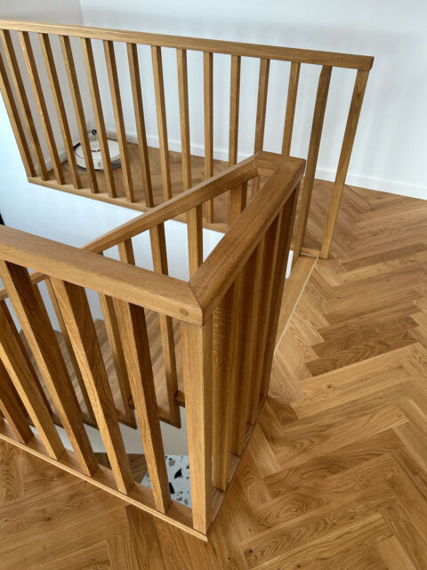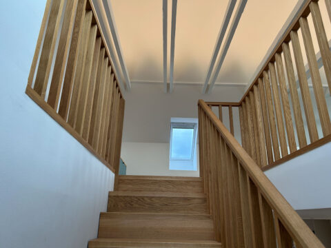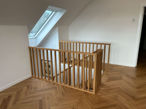 Trin i 40mm massiv eg gennemgående stave, olieret | Stødtrin 20mm massiv eg gennemgående stave, lige forkant, olieret | Gelænder med 30x40mm balustre istemt i 50x40mm håndliste alt udført i massiv eg olie | Opsadlet vanger massiv fyr/HDF hvid malet | (Ref: 136802)
