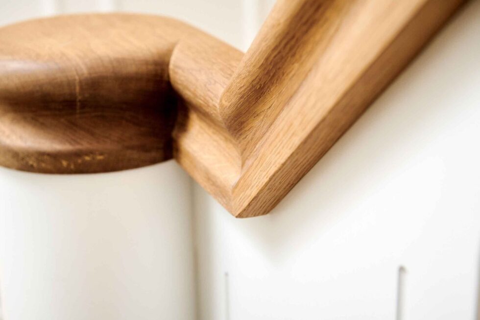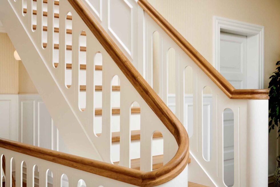Vanger istemt, hvidmalet | Trin og håndliste H5 i eg | Pladegelænder med udfræsninger og spor | Stødtrin, hvidmalet | Første trin som klodstrin | P-mægler med kattepote