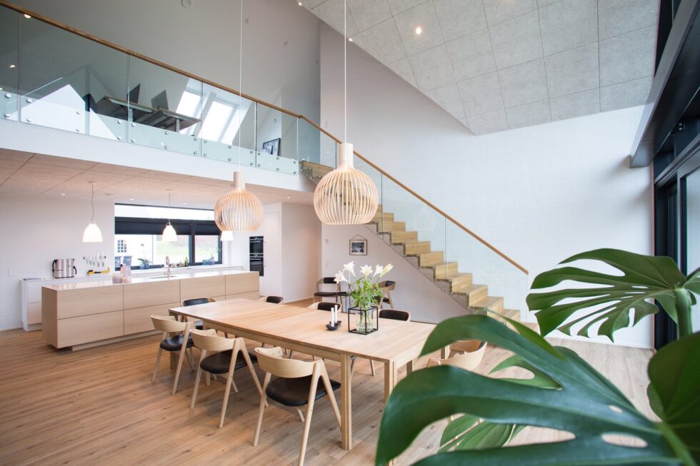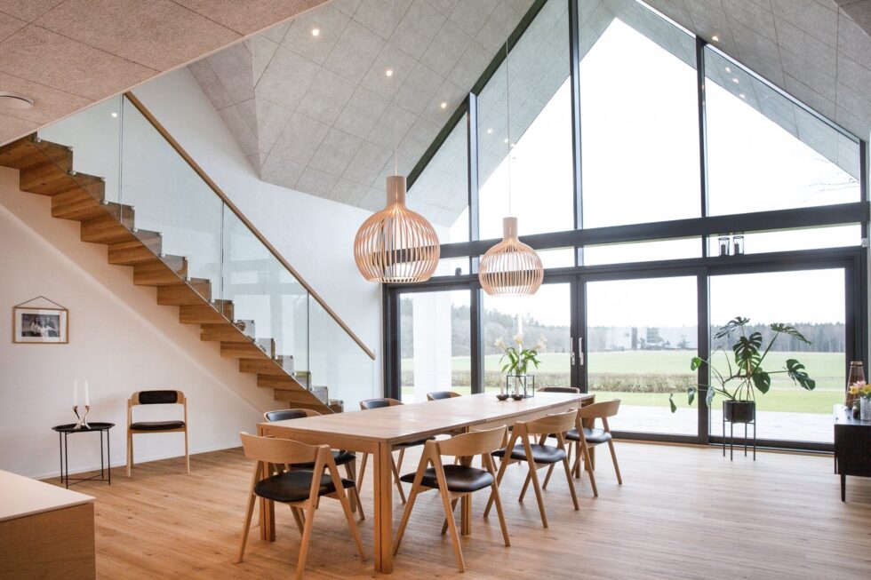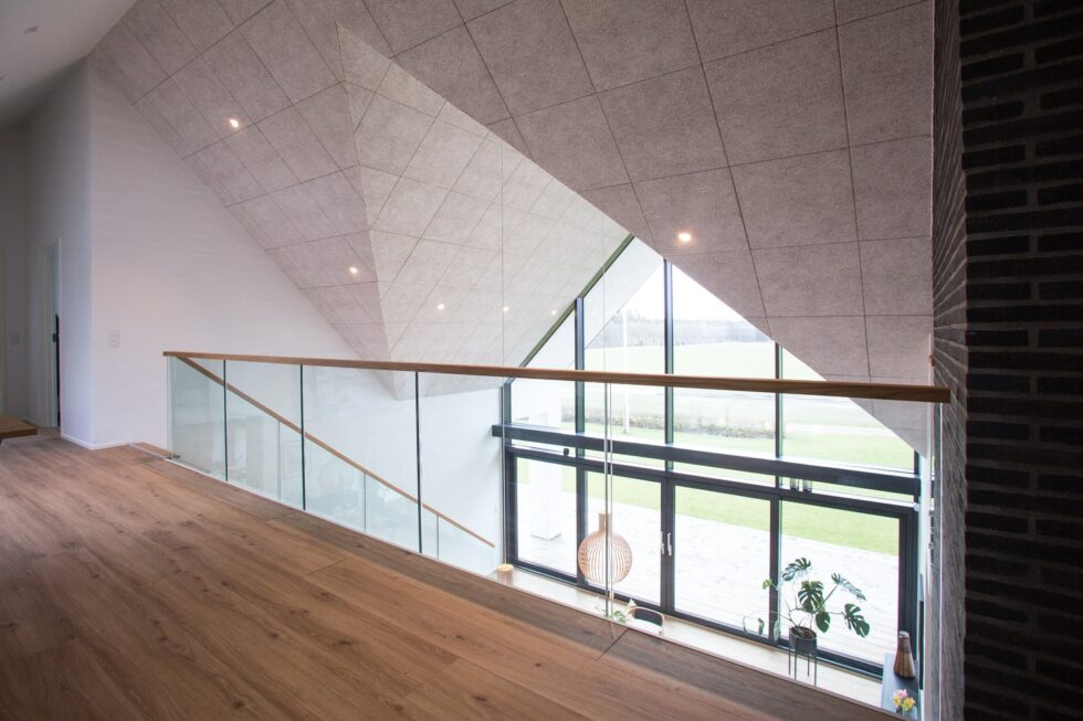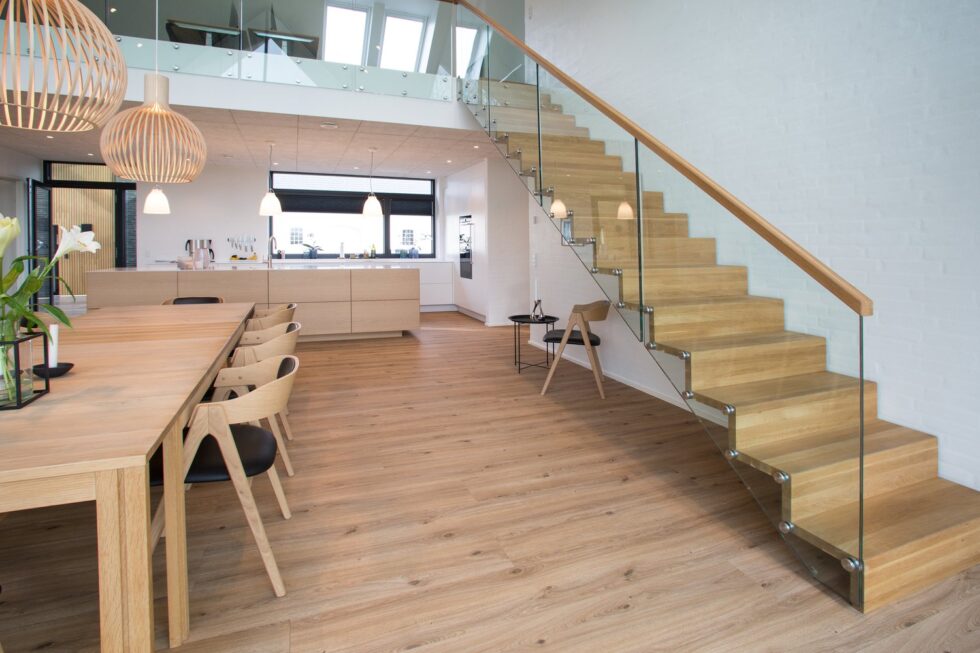Musetrappe med trin i 40mm massiv eg | Vange, opsadlet, hvidmalet | Stødtrin i eg – ligger glat med forkant trin | 8+8 mm glasgelænder monteret på trinender med grisetryner | På glas er en håndliste i eg monteret | (Ref: 281801)