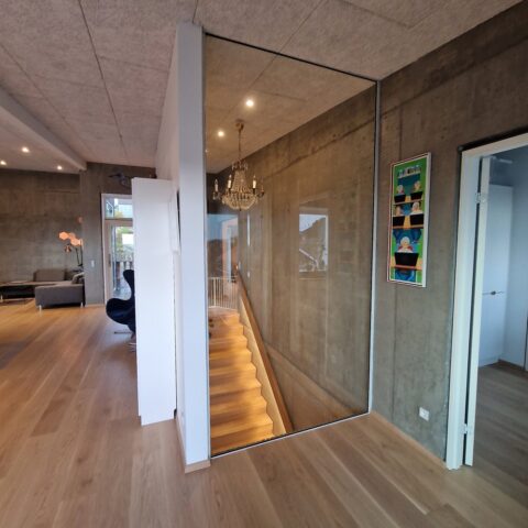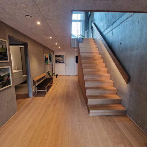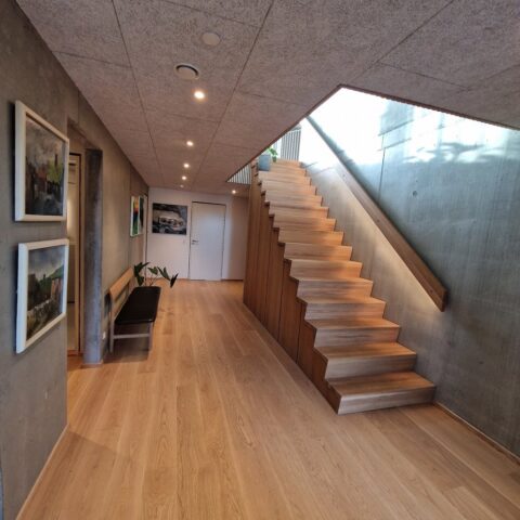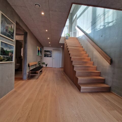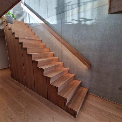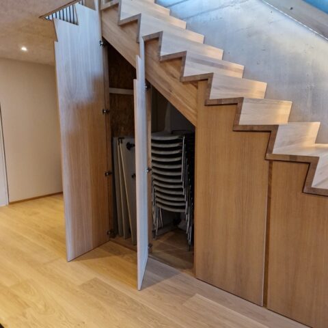 Musetrappe i eg med skråt stillede stødtrin | Væghåndliste 40 x 150 mm med LED belysning | Under trappen er låger i eg finér | (Ref: 561988)